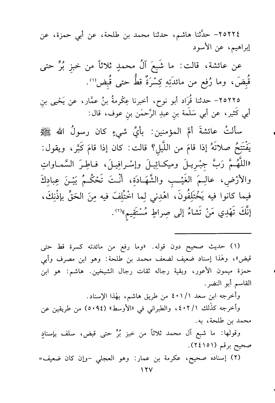 ٢٥٢٢٥ - حَدَّثَنَا قُرَادٌ أَبُو نُوحٍ، أَخْبَرَنَا عِكْرِمَةُ بْنُ عَمَّارٍ، عَنْ يَحْيَى بْنِ أَبِي كَثِيرٍ، عَنْ أَبِي سَلَمَةَ بْنِ عَبْدِ الرَّحْمَنِ بْنِ عَوْفٍ، قَالَ: سَأَلْتُ عَائِشَةَ، أُمَّ الْمُؤْمِنِينَ: بِأَيِّ شَيْءٍ كَانَ رَسُولُ اللهِ صَلَّى اللهُ عَلَيْهِ وَسَلَّمَ يَفْتَتِحُ صَلَاتَهُ إِذَا قَامَ مِنَ اللَّيْلِ؟ قَالَتْ: كَانَ إِذَا قَامَ كَبَّرَ، وَيَقُولُ: " اللهُمَّ رَبَّ جِبْرِيلَ وَمِيكَائِيلَ وَإِسْرَافِيلَ، فَاطِرَ السَّمَاوَاتِ وَالْأَرْضِ، عَالِمَ الْغَيْبِ وَالشَّهَادَةِ، أَنْتَ تَحْكُمُ بَيْنَ عِبَادِكَ فِيمَا كَانُوا فِيهِ يَخْتَلِفُونَ، اهْدِنِي لِمَا اخْتَلَفْتُ فِيهِ مَنِ الْحَقِّ بِإِذْنِكَ، إِنَّكَ تَهْدِي مَنْ تَشَاءُ إِلَى صِرَاطٍ مُسْتَقِيمٍ " (٢)