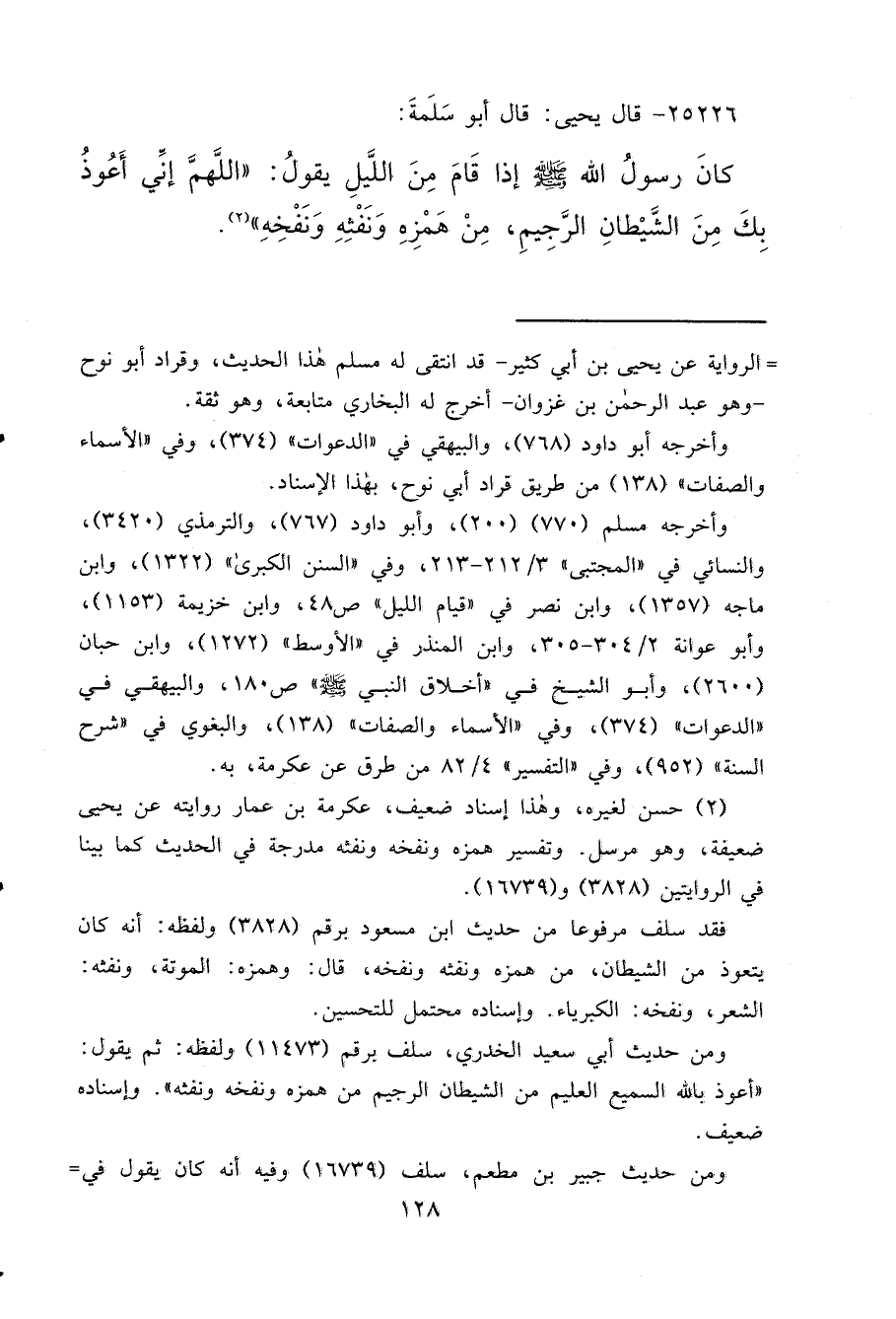 ٢٥٢٢٦ - قَالَ يَحْيَى: قَالَ أَبُو سَلَمَةَ: كَانَ رَسُولُ اللهِ صَلَّى اللهُ عَلَيْهِ وَسَلَّمَ إِذَا قَامَ مِنَ اللَّيْلِ يَقُولُ: " اللهُمَّ إِنِّي أَعُوذُ بِكَ مِنَ الشَّيْطَانِ الرَّجِيمِ، مِنْ هَمْزِهِ وَنَفْثِهِ وَنَفْخِهِ " (٢)