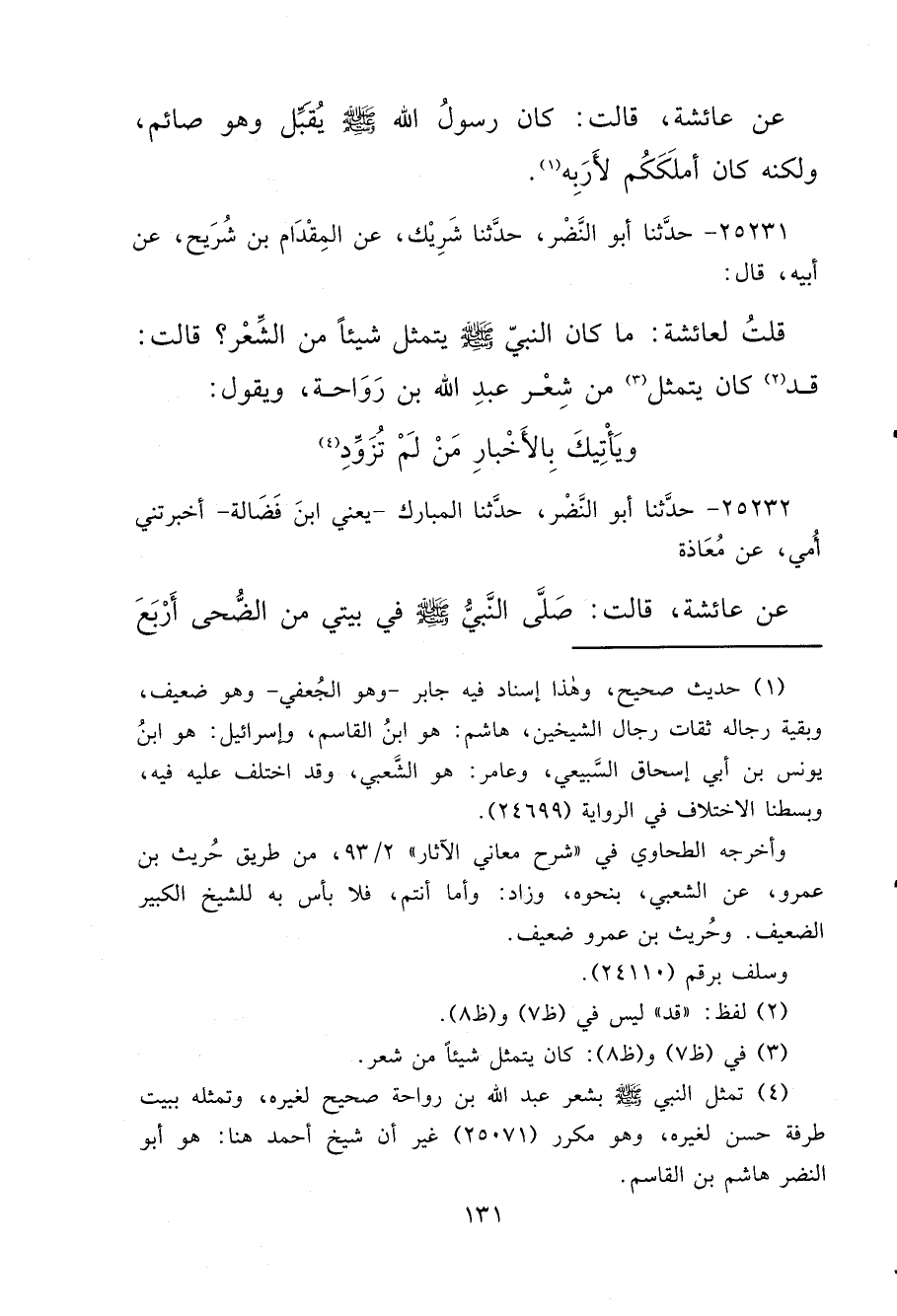 (٤) تمثل النبي صَلَّى اللهُ عَلَيْهِ وَسَلَّمَ بشعر عبد الله بن رواحة صحيح لغيره، وتمثله ببيت طرفة حسن لغيره، وهو مكرر (٢٥٠٧١) غير أن شيخ أحمد هنا: هو أبو النضر هاشم بن القاسم.