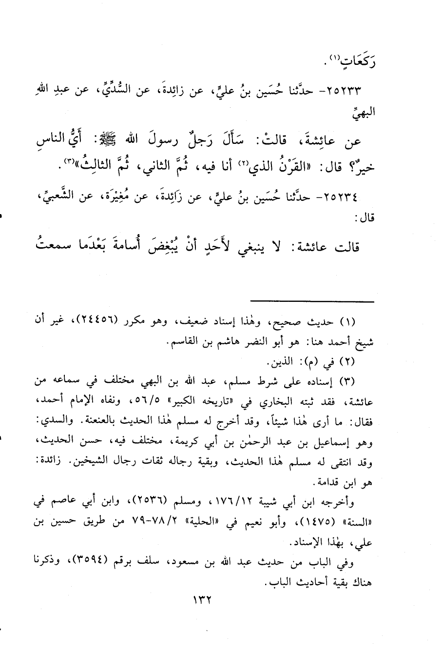٢٥٢٣٣ - حَدَّثَنَا حُسَيْنُ بْنُ عَلِيٍّ، عَنْ زَائِدَةَ، عَنْ السُّدِّيِّ، عَنْ عَبْدِ اللهِ الْبَهِيِّ، عَنْ عَائِشَةَ، قَالَتْ: سَأَلَ رَجُلٌ رَسُولَ اللهِ صَلَّى اللهُ عَلَيْهِ وَسَلَّمَ: أَيُّ النَّاسِ خَيْرٌ؟ قَالَ: " الْقَرْنُ الَّذِي (٢) أَنَا فِيهِ، ثُمَّ الثَّانِي، ثُمَّ الثَّالِثُ " (٣)