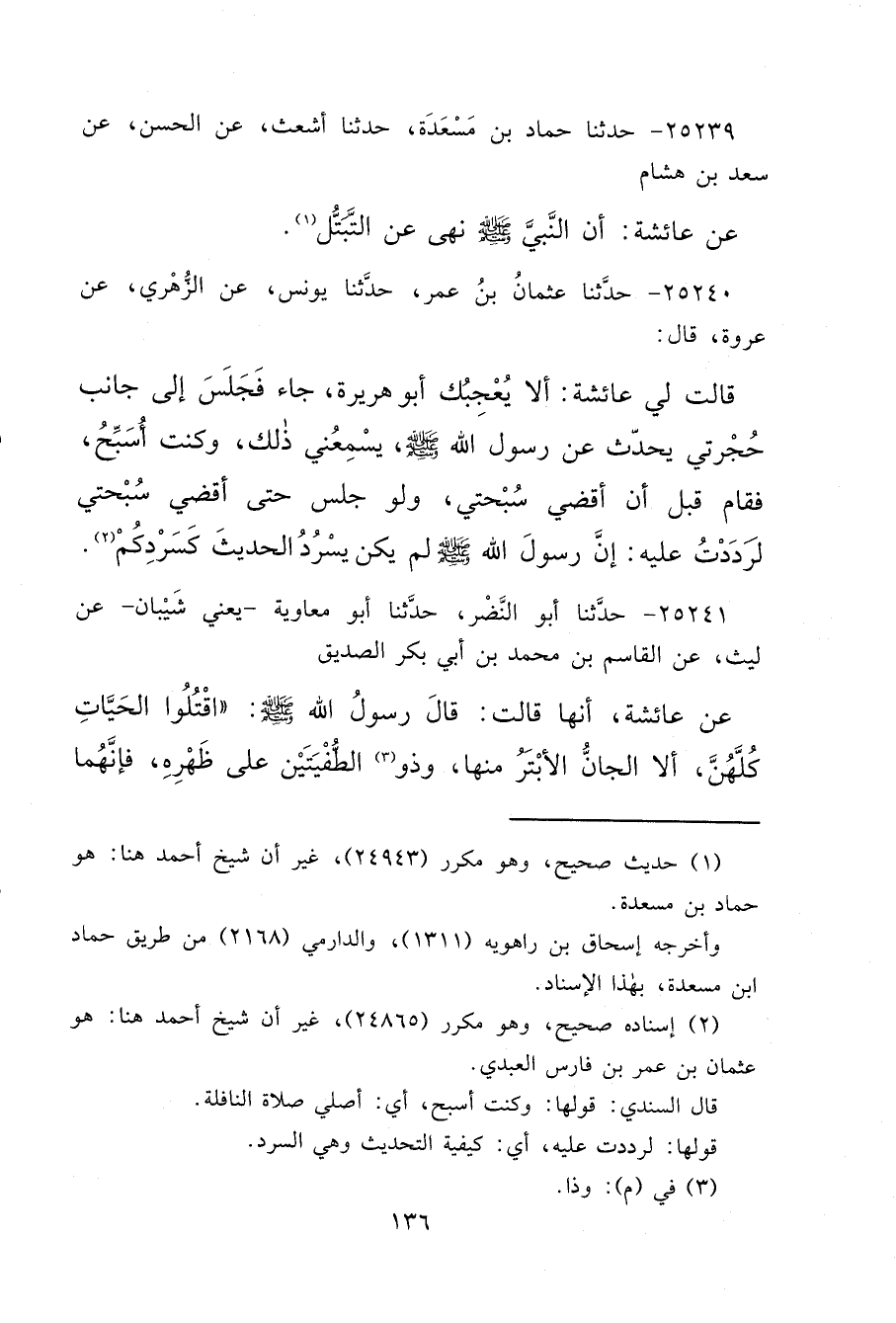 ٢٥٢٤١ - حَدَّثَنَا أَبُو النَّضْرِ، حَدَّثَنَا أَبُو مُعَاوِيَةَ يَعْنِي شَيْبَانَ، عَنْ لَيْثٍ، عَنِ الْقَاسِمِ بْنِ مُحَمَّدِ بْنِ أَبِي بَكْرٍ الصِّدِّيقِ، عَنْ عَائِشَةَ، أَنَّهَا قَالَتْ: قَالَ رَسُولُ اللهِ صَلَّى اللهُ عَلَيْهِ وَسَلَّمَ: " اقْتُلُوا الْحَيَّاتِ كُلَّهُنَّ، إِلَّا الْجَانَّ الْأَبْتَرَ مِنْهَا، وَذَا (٣) الطُّفْيَتَيْنِ عَلَى ظَهْرِهِ، فَإِنَّهُمَا