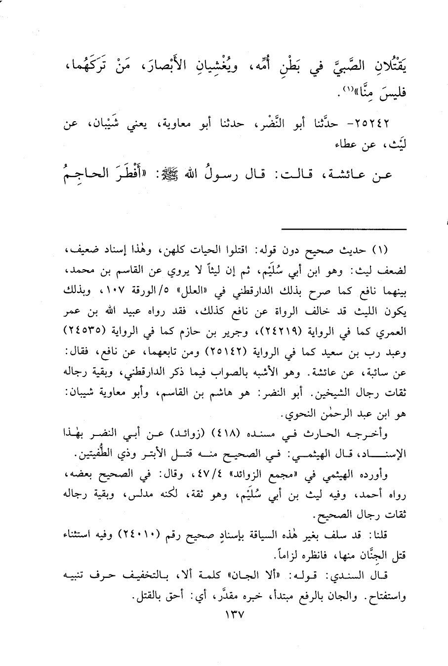 ٢٥٢٤٢ - حَدَّثَنَا أَبُو النَّضْرِ، حَدَّثَنَا أَبُو مُعَاوِيَةَ يَعْنِي شَيْبَانَ، عَنْ لَيْثٍ، عَنْ عَطَاءٍ، عَنْ عَائِشَةَ، قَالَتْ: قَالَ رَسُولُ اللهِ صَلَّى اللهُ عَلَيْهِ وَسَلَّمَ: " أَفْطَرَ الْحَاجِمُ