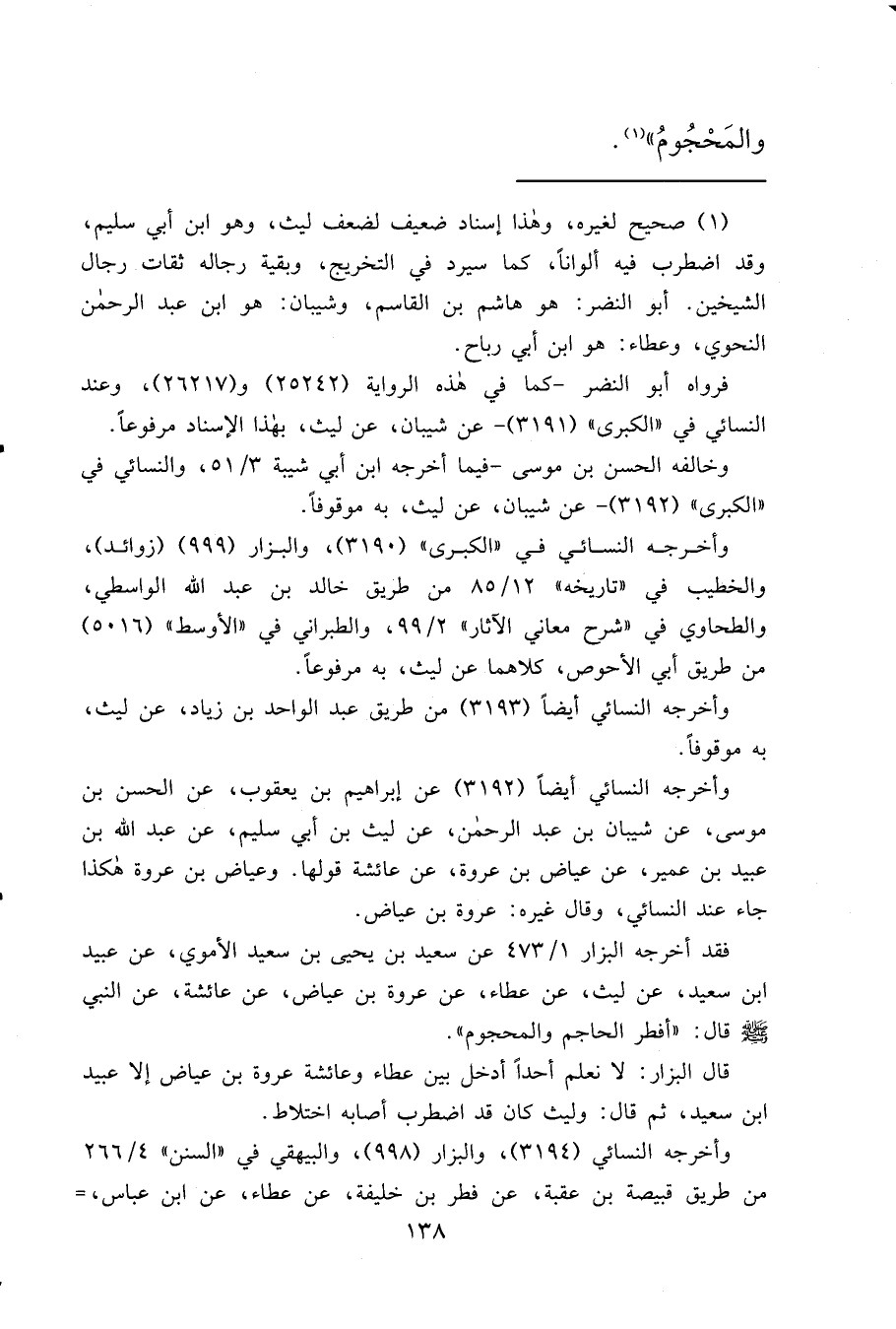 وأخرجه النسائي أيضاً (٣١٩٣) من طريق عبد الواحد بن زياد، عن ليث، به موقوفاً.