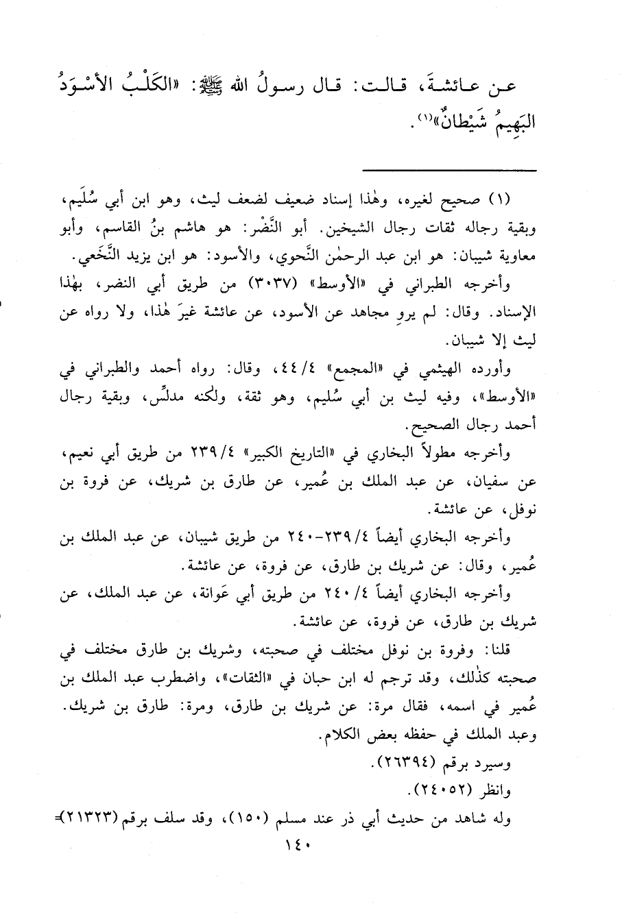 عَنْ عَائِشَةَ، قَالَتْ: قَالَ رَسُولُ اللهِ صَلَّى اللهُ عَلَيْهِ وَسَلَّمَ: " الْكَلْبُ الْأَسْوَدُ الْبَهِيمُ شَيْطَانٌ " (١)