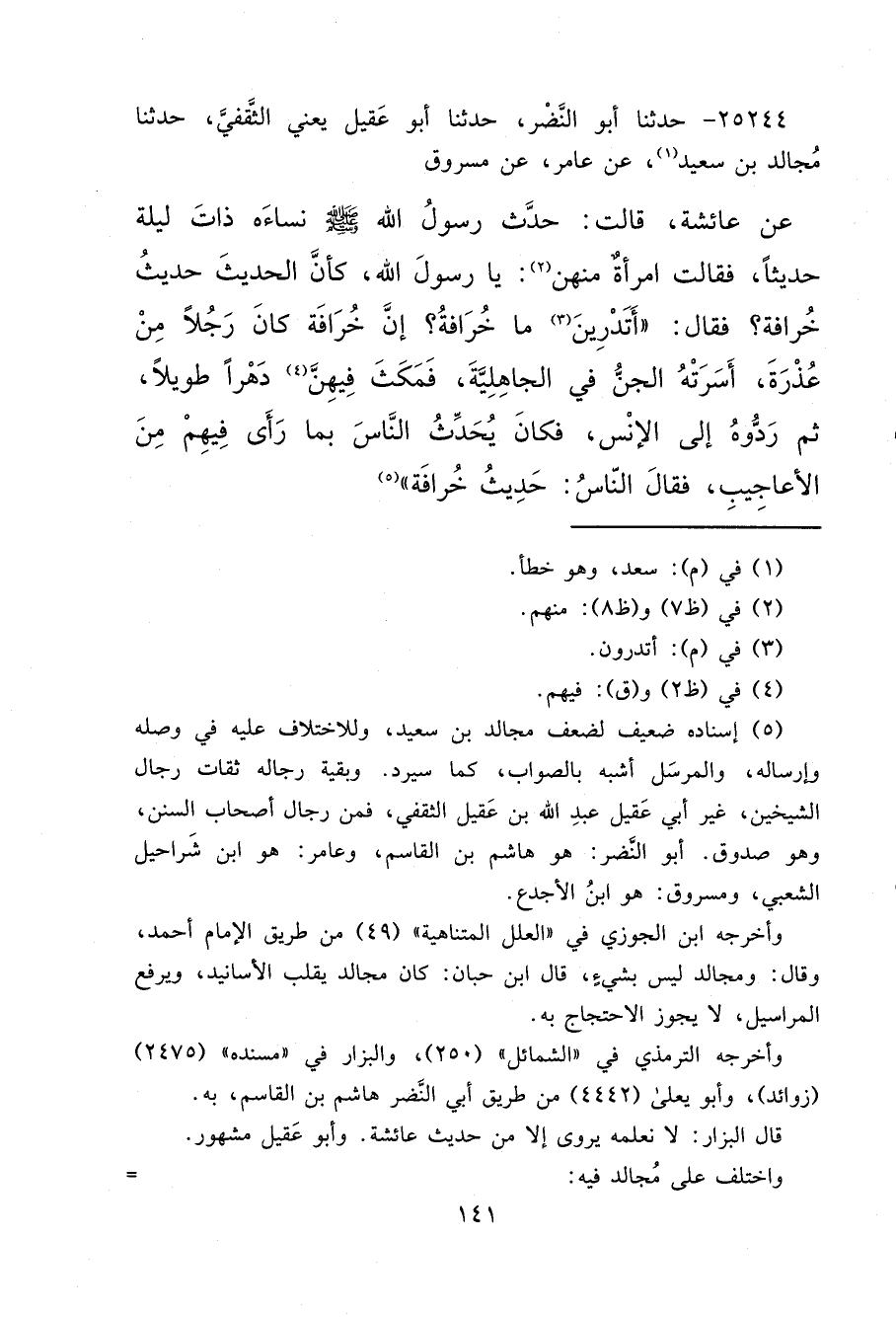 ٢٥٢٤٤ - حَدَّثَنَا أَبُو النَّضْرِ، حَدَّثَنَا أَبُو عَقِيلٍ يَعْنِي الثَّقَفِيَّ، حَدَّثَنَا مُجَالِدُ بْنُ سَعِيدٍ، (١) عَنْ عَامِرٍ، عَنْ مَسْرُوقٍ، عَنْ عَائِشَةَ، قَالَتْ: حَدَّثَ رَسُولُ اللهِ صَلَّى اللهُ عَلَيْهِ وَسَلَّمَ نِسَاءَهُ ذَاتَ لَيْلَةٍ حَدِيثًا، فَقَالَتْ امْرَأَةٌ مِنْهُنَّ: (٢) يَا رَسُولَ اللهِ، كَانَ الْحَدِيثُ حَدِيثَ خُرَافَةَ؟ فَقَالَ: " أَتَدْرِينَ (٣) مَا خُرَافَةُ؟ إِنَّ خُرَافَةَ كَانَ رَجُلًا مِنْ عُذْرَةَ، أَسَرَتْهُ الْجِنُّ فِي الْجَاهِلِيَّةِ، فَمَكَثَ فِيهِنَّ (٤) دَهْرًا طَوِيلًا، ثُمَّ رَدُّوهُ إِلَى الْإِنْسِ، فَكَانَ يُحَدِّثُ النَّاسَ بِمَا رَأَى فِيهِمْ مِنَ الْأَعَاجِيبِ، فَقَالَ النَّاسُ: حَدِيثُ خُرَافَةَ " (٥)