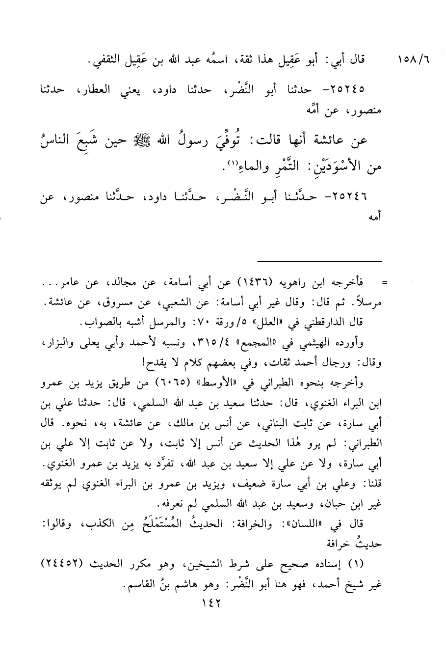 ٢٥٢٤٥ - حَدَّثَنَا أَبُو النَّضْرِ، حَدَّثَنَا دَوُادُ يَعْنِي الْعَطَّارَ، حَدَّثَنَا مَنْصُورٌ، عَنْ أُمِّهِ، عَنْ عَائِشَةَ، أَنَّهَا قَالَتْ: " تُوُفِّيَ رَسُولُ اللهِ صَلَّى اللهُ عَلَيْهِ وَسَلَّمَ حِينَ شَبِعَ النَّاسُ مِنَ الْأَسْوَدَيْنِ: التَّمْرِ وَالْمَاءِ " (١)