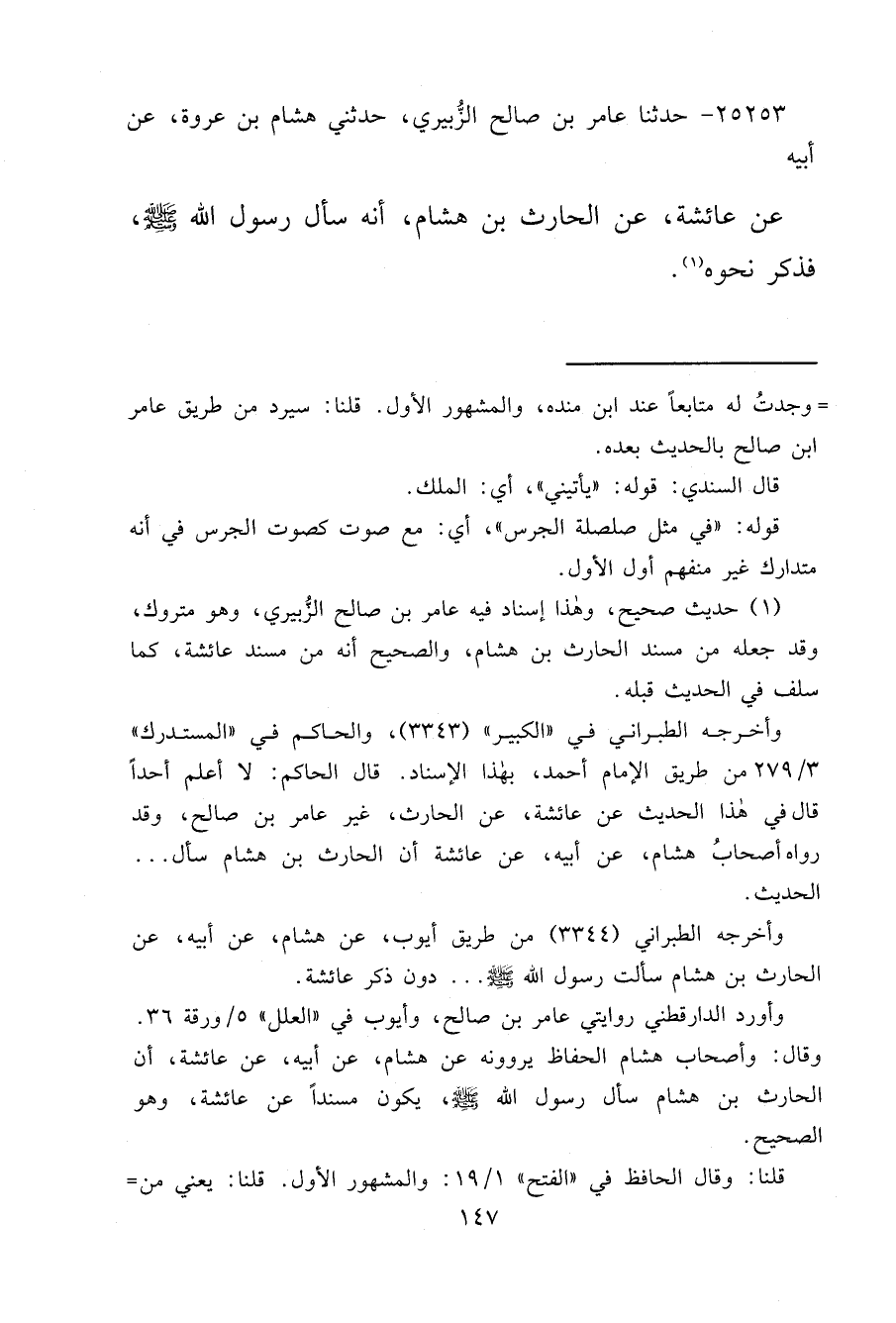 ٢٥٢٥٣ - حَدَّثَنَا عَامِرُ بْنُ صَالِحٍ الزُّبَيْرِيُّ، حَدَّثَنِي هِشَامُ بْنُ عُرْوَةَ، عَنْ أَبِيهِ، عَنْ عَائِشَةَ، عَنِ الْحَارِثِ بْنِ هِشَامٍ، أَنَّهُ سَأَلَ رَسُولَ اللهِ صَلَّى اللهُ عَلَيْهِ وَسَلَّمَ، فَذَكَرَ نَحْوَهُ (١)
