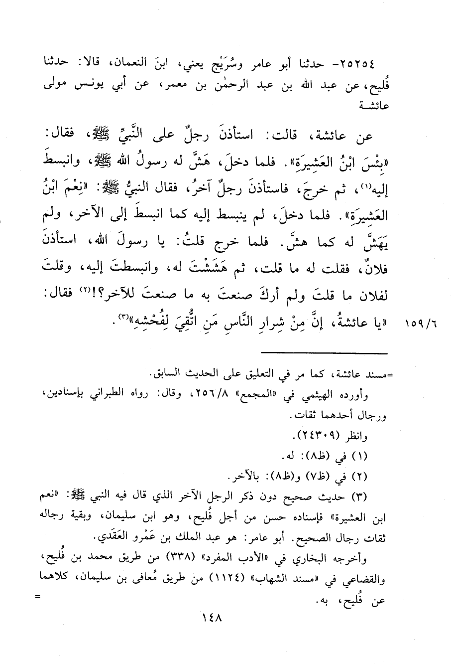 ٢٥٢٥٤ - حَدَّثَنَا أَبُو عَامِرٍ، وَسُرَيْجٌ يَعْنِي ابْنَ النُّعْمَانِ، قَالَا: حَدَّثَنَا فُلَيْحٌ، عَنْ عَبْدِ اللهِ بْنِ عَبْدِ الرَّحْمَنِ بْنِ مَعْمَرٍ، عَنْ أَبِي يُونُسَ، مَوْلَى عَائِشَةَ، عَنْ عَائِشَةَ، قَالَتْ: اسْتَأْذَنَ رَجُلٌ عَلَى النَّبِيِّ صَلَّى اللهُ عَلَيْهِ وَسَلَّمَ، فَقَالَ: " بِئْسَ ابْنُ الْعَشِيرَةِ " فَلَمَّا دَخَلَ، هَشَّ لَهُ رَسُولُ اللهِ صَلَّى اللهُ عَلَيْهِ وَسَلَّمَ، وَانْبَسَطَ إِلَيْهِ، (١) ثُمَّ خَرَجَ، فَاسْتَأْذَنَ رَجُلٌ آخَرُ، فَقَالَ النَّبِيُّ صَلَّى اللهُ عَلَيْهِ وَسَلَّمَ: " نِعْمَ ابْنُ الْعَشِيرَةِ " فَلَمَّا دَخَلَ، لَمْ يَنْبَسِطْ إِلَيْهِ كَمَا انْبَسَطَ إِلَى الْآخَرِ، وَلَمْ يَهَشَّ لَهُ كَمَا هَشَّ. فَلَمَّا خَرَجَ قُلْتُ: يَا رَسُولَ اللهِ، اسْتَأْذَنَ فُلَانٌ، فَقُلْتَ لَهُ مَا قُلْتَ، ثُمَّ هَشَشْتَ لَهُ، وَانْبَسَطْتَ إِلَيْهِ، وَقُلْتَ لِفُلَانٍ مَا قُلْتَ وَلَمْ أَرَكَ صَنَعْتَ بِهِ مَا صَنَعْتَ لِلْآخَرِ؟ (٢) فَقَالَ: " يَا عَائِشَةُ، إِنَّ مِنْ شِرَارِ النَّاسِ مَنْ اتُّقِيَ لِفُحْشِهِ " (٣)