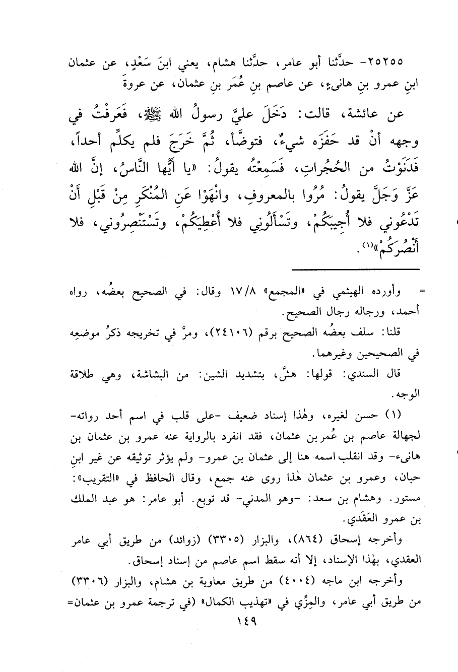 ٢٥٢٥٥ - حَدَّثَنَا أَبُو عَامِرٍ، حَدَّثَنَا هِشَامٌ يَعْنِي ابْنَ سَعْدٍ، عَنْ عَمْرِو بْنِ عُثْمَانَ بْنِ هَانِئٍ، عَنْ عَاصِمِ بْنِ عُمَرَ بْنِ عُثْمَانَ، عَنْ عُرْوَةَ، عَنْ عَائِشَةَ، قَالَتْ: دَخَلَ عَلَيَّ رَسُولُ اللهِ صَلَّى اللهُ عَلَيْهِ وَسَلَّمَ، فَعَرَفْتُ فِي وَجْهِهِ أَنْ قَدْ حَفَزَهُ شَيْءٌ، فَتَوَضَّأَ، ثُمَّ خَرَجَ فَلَمْ يُكَلِّمْ أَحَدًا، فَدَنَوْتُ مِنَ الْحُجُرَاتِ، فَسَمِعْتُهُ يَقُولُ: " يَا أَيُّهَا النَّاسُ، إِنَّ اللهَ عَزَّ وَجَلَّ يَقُولُ: مُرُوا بِالْمَعْرُوفِ، وَانْهَوْا عَنِ الْمُنْكَرِ مِنْ قَبْلِ أَنْ تَدْعُونِي فَلَا أُجِيبُكُمْ، وَتَسْأَلُونِي فَلَا أُعْطِيكُمْ، وَتَسْتَنْصِرُونِي، فَلَا أَنْصُرُكُمْ " (١)