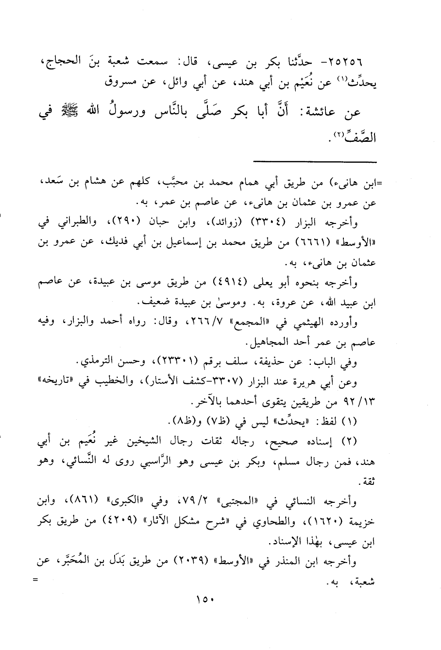 ٢٥٢٥٦ - حَدَّثَنَا بَكْرُ بْنُ عِيسَى، قَالَ: سَمِعْتُ شُعْبَةَ بْنَ الْحَجَّاجِ، يُحَدِّثُ (١) عَنْ نُعَيْمِ بْنِ أَبِي هِنْدٍ، عَنْ أَبِي وَائِلٍ، عَنْ مَسْرُوقٍ، عَنْ عَائِشَةَ: " أَنَّ أَبَا بَكْرٍ صَلَّى بِالنَّاسِ وَرَسُولُ اللهِ صَلَّى اللهُ عَلَيْهِ وَسَلَّمَ فِي الصَّفِّ " (٢)
