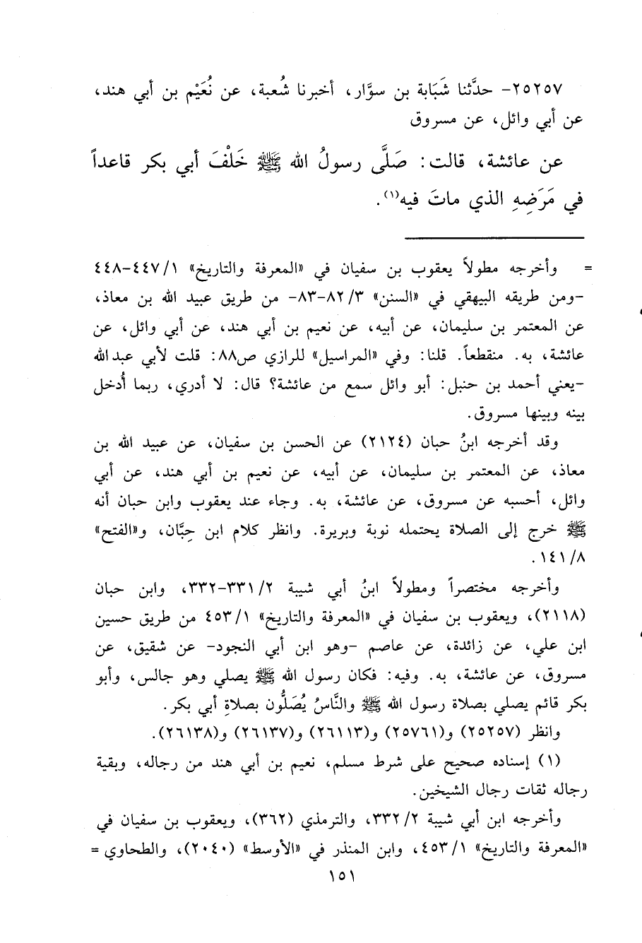 ٢٥٢٥٧ - حَدَّثَنَا شَبَابَةُ بْنُ سَوَّارٍ، أَخْبَرَنَا شُعْبَةُ، عَنْ نُعَيْمِ بْنِ أَبِي هِنْدٍ، عَنْ أَبِي وَائِلٍ، عَنْ مَسْرُوقٍ، عَنْ عَائِشَةَ، قَالَتْ: " صَلَّى رَسُولُ اللهِ صَلَّى اللهُ عَلَيْهِ وَسَلَّمَ خَلْفَ أَبِي بَكْرٍ قَاعِدًا فِي مَرَضِهِ الَّذِي مَاتَ فِيهِ " (١)