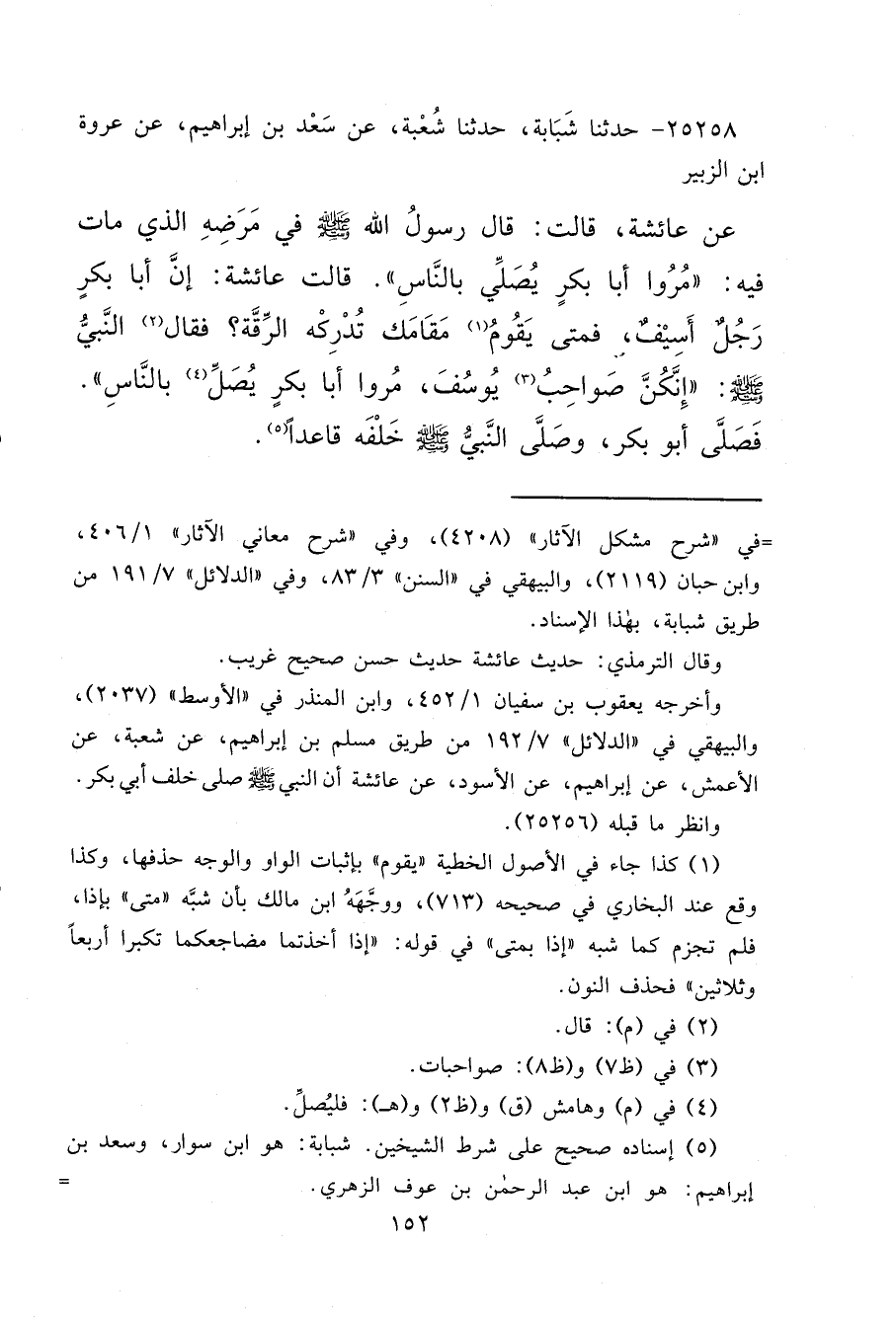 ٢٥٢٥٨ - حَدَّثَنَا شَبَابَةُ، حَدَّثَنَا شُعْبَةُ، عَنْ سَعْدِ بْنِ إِبْرَاهِيمَ، عَنْ عُرْوَةَ بْنِ الزُّبَيْرِ، عَنْ عَائِشَةَ، قَالَتْ: قَالَ رَسُولُ اللهِ صَلَّى اللهُ عَلَيْهِ وَسَلَّمَ فِي مَرَضِهِ الَّذِي مَاتَ فِيهِ: " مُرُوا أَبَا بَكْرٍ يُصَلِّي بِالنَّاسِ " قَالَتْ عَائِشَةُ: إِنَّ أَبَا بَكْرٍ رَجُلٌ أَسِيفٌ، فَمَتَى يَقُومُ (١) مَقَامَكَ تُدْرِكُهُ الرِّقَةُ، فَقَالَ (٢) النَّبِيُّ صَلَّى اللهُ عَلَيْهِ وَسَلَّمَ: " إِنَّكُنَّ صَوَاحِبُ (٣) يُوسُفَ، مُرُوا أَبَا بَكْرٍ يُصَلِّ (٤) بِالنَّاسِ " فَصَلَّى أَبُو بَكْرٍ، وَصَلَّى النَّبِيُّ صَلَّى اللهُ عَلَيْهِ وَسَلَّمَ خَلْفَهُ قَاعِدًا (٥)