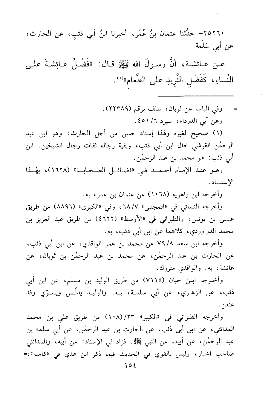 ٢٥٢٦٠ - حَدَّثَنَا عُثْمَانُ بْنُ عُمَرَ، أَخْبَرَنَا ابْنُ أَبِي ذِئْبٍ، عَنِ الْحَارِثِ، عَنْ أَبِي سَلَمَةَ، عَنْ عَائِشَةَ، أَنَّ رَسُولَ اللهِ صَلَّى اللهُ عَلَيْهِ وَسَلَّمَ قَالَ: " فَضْلُ عَائِشَةَ عَلَى النِّسَاءِ، كَفَضْلِ الثَّرِيدِ عَلَى الطَّعَامِ " (١)