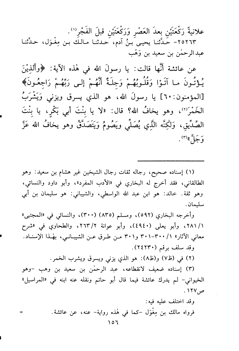 ٢٥٢٦٣ - حَدَّثَنَا يَحْيَى بْنُ آدَمَ، حَدَّثَنَا مَالِكُ بْنُ مِغْوَلٍ، حَدَّثَنَا عَبْدُ الرَّحْمَنِ بْنُ سَعِيدِ بْنِ وَهْبٍ، عَنْ عَائِشَةَ، أَنَّهَا قَالَتْ: يَا رَسُولَ اللهِ فِي هَذِهِ الْآيَةِ: {الَّذِينَ يُؤْتُونَ مَا آتَوْا وَقُلُوبُهُمْ وَجِلَةٌ} [المؤمنون: ٦٠] أَنَّهُمْ إِلَى رَبِّهِمْ رَاجِعُونَ يَا رَسُولَ اللهِ، هُوَ الَّذِي يَسْرِقُ وَيَزْنِي وَيَشْرَبُ الْخَمْرَ، (٢) وَهُوَ يَخَافُ اللهَ؟ قَالَ: " لَا يَا بِنْتَ أَبِي بَكْرٍ، يَا بِنْتَ الصِّدِّيقِ، وَلَكِنَّهُ الَّذِي يُصَلِّي وَيَصُومُ وَيَتَصَدَّقُ وَهُوَ يُخَافُ اللهَ عَزَّ وَجَلَّ " (٣)