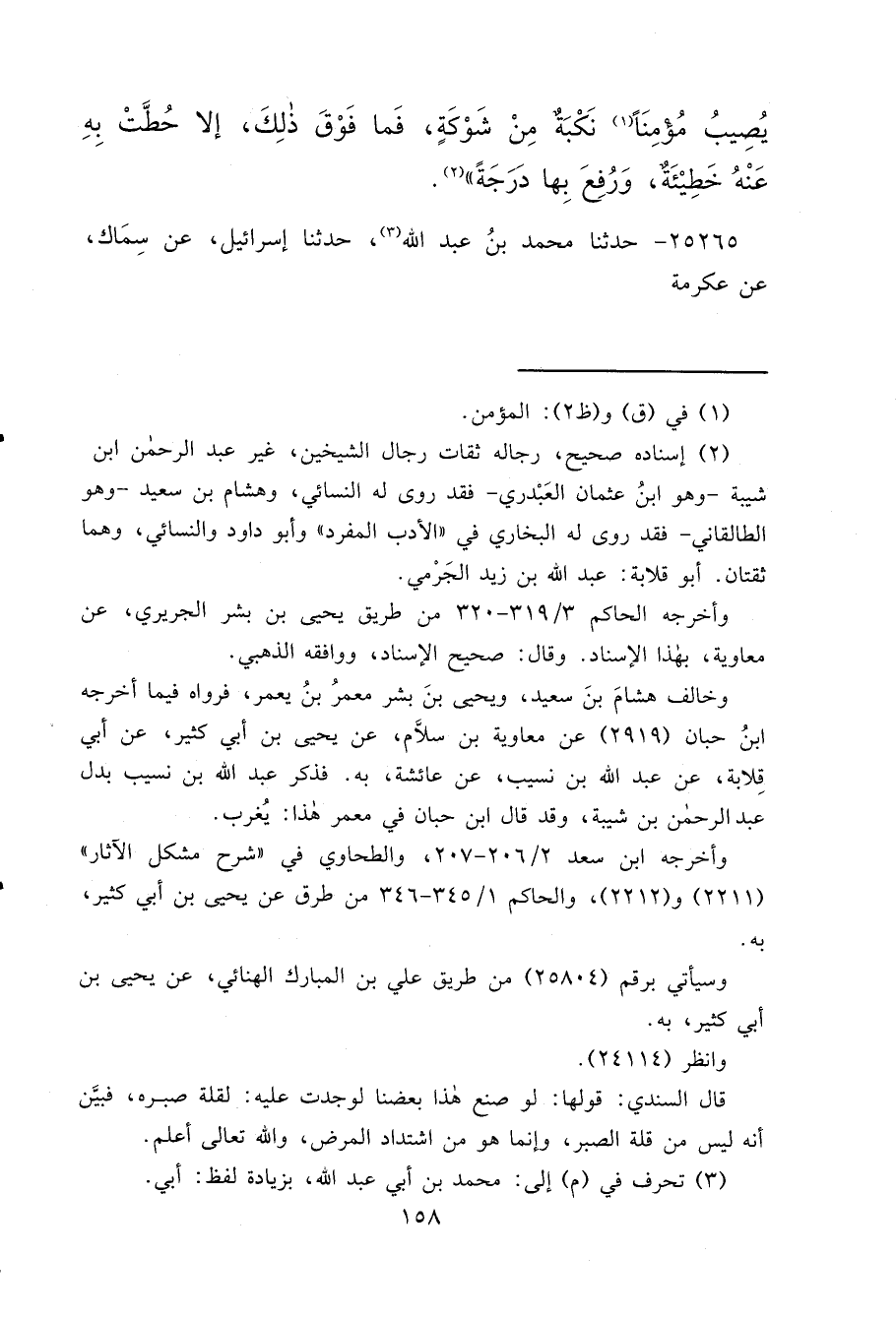 يُصِيبُ مُؤْمِنًا (١) نَكْبَةٌ مِنْ شَوْكَةٍ، فَمَا فَوْقَ ذَلِكَ، إِلَّا حُطَّتْ بِهِ عَنْهُ خَطِيئَةٌ، وَرُفِعَ بِهَا دَرَجَةً " (٢)