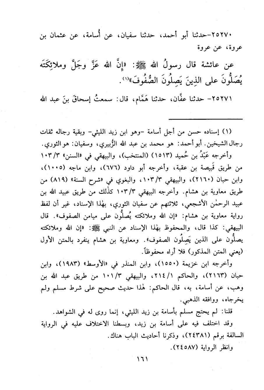 ٢٥٢٧٠ - حَدَّثَنَا أَبُو أَحْمَدَ، حَدَّثَنَا سُفْيَانُ، عَنْ أُسَامَةَ، عَنْ عُثْمَانَ بْنِ عُرْوَةَ، عَنْ عُرْوَةَ، عَنْ عَائِشَةَ، قَالَ رَسُولُ اللهِ صَلَّى اللهُ عَلَيْهِ وَسَلَّمَ: " إِنَّ اللهَ عَزَّ وَجَلَّ وَمَلَائِكَتَهُ يُصَلُّونَ عَلَى الَّذِينَ يَصِلُونَ الصُّفُوفَ " (١)
