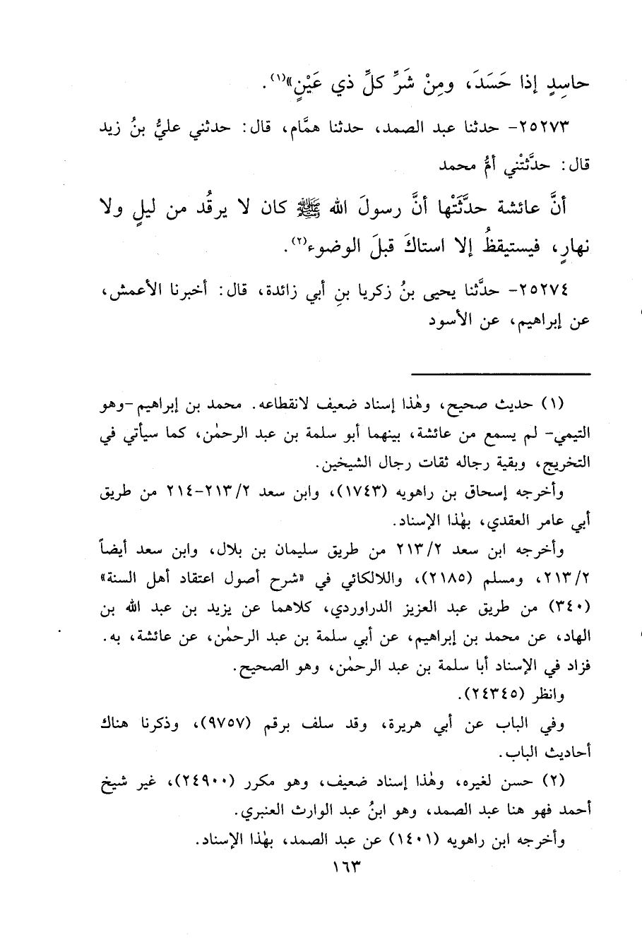 ٢٥٢٧٣ - حَدَّثَنَا عَبْدُ الصَّمَدِ، حَدَّثَنَا هَمَّامٌ، قَالَ: حَدَّثَنِي عَلِيُّ بْنُ زَيْدٍ، قَالَ: حَدَّثَتْنِي أُمُّ مُحَمَّدٍ، أَنَّ عَائِشَةَ، حَدَّثَتْهَا: " أَنَّ رَسُولَ اللهِ صَلَّى اللهُ عَلَيْهِ وَسَلَّمَ كَانَ لَا يَرْقُدُ مِنْ لَيْلٍ وَلَا نَهَارٍ، فَيَسْتَيْقِظُ إِلَّا اسْتَاكَ قَبْلَ الْوُضُوءِ " (٢)