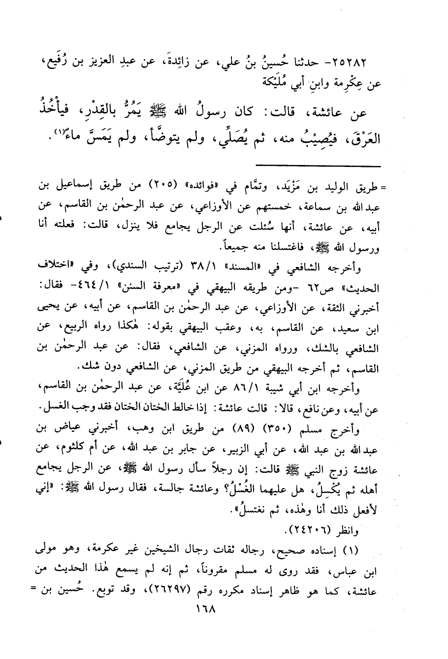 ٢٥٢٨٢ - حَدَّثَنَا حُسَيْنُ بْنُ عَلِيٍّ، عَنْ زَائِدَةَ، عَنْ عَبْدِ الْعَزِيزِ بْنِ رُفَيْعٍ، عَنْ عِكْرِمَةَ، وَابْنِ أَبِي مُلَيْكَةَ، عَنْ عَائِشَةَ، قَالَتْ: " كَانَ رَسُولُ اللهِ صَلَّى اللهُ عَلَيْهِ وَسَلَّمَ يَمُرُّ بِالْقِدْرِ، فَيَأْخُذُ الْعَرْقَ، فَيُصِيبُ مِنْهُ، ثُمَّ يُصَلِّي، وَلَمْ يَتَوَضَّأْ، وَلَمْ يَمَسَّ مَاءً " (١)