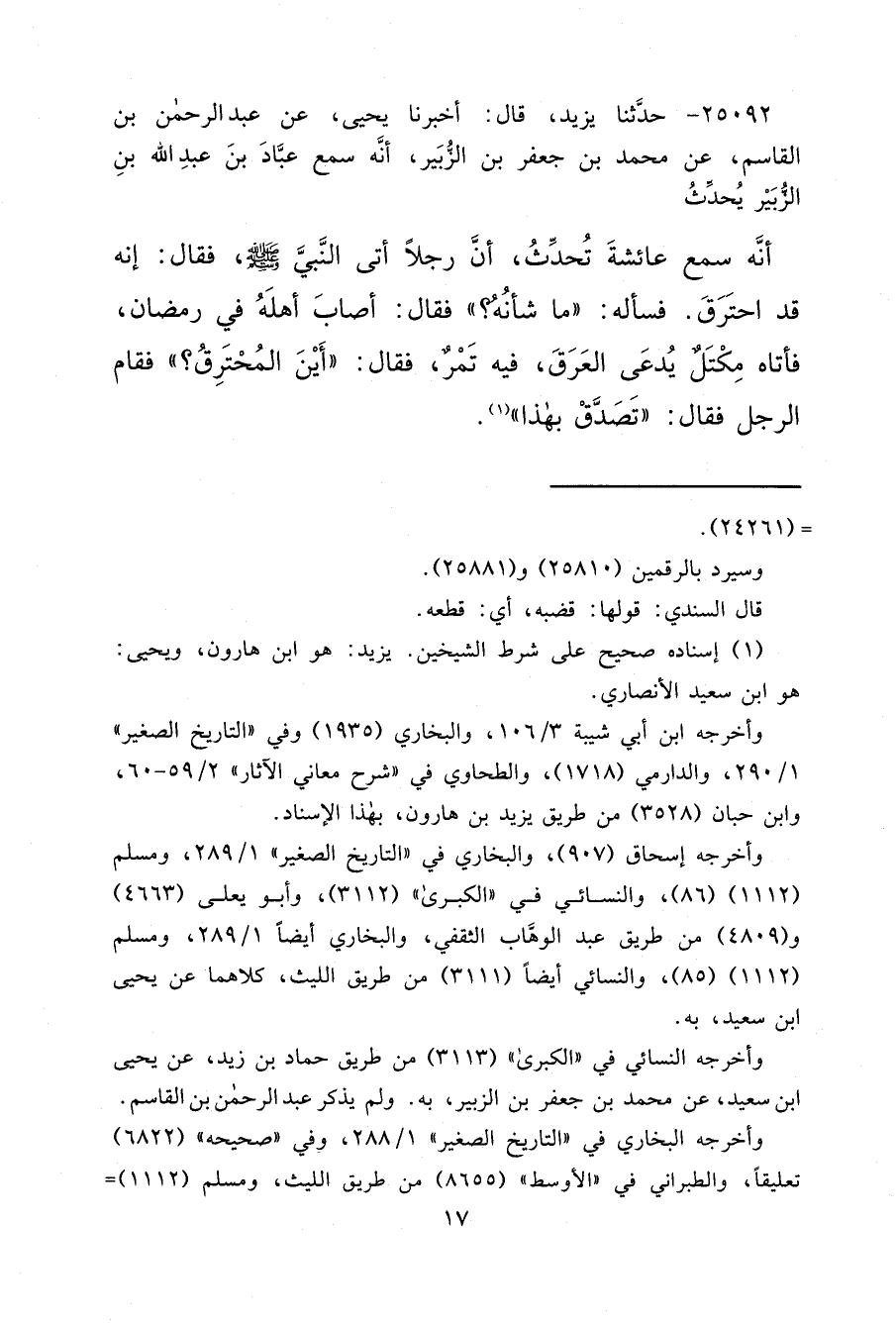 ٢٥٠٩٢ - حَدَّثَنَا يَزِيدُ، قَالَ: أَخْبَرَنَا يَحْيَى، عَنْ عَبْدِ الرَّحْمَنِ بْنِ الْقَاسِمِ، عَنْ مُحَمَّدِ بْنِ جَعْفَرِ بْنِ الزُّبَيْرِ، أَنَّهُ سَمِعَ عَبَّادَ بْنَ عَبْدِ اللهِ بْنِ الزُّبَيْرِ، يُحَدِّثُ: أَنَّهُ سَمِعَ عَائِشَةَ، تُحَدِّثُ، أَنَّ رَجُلًا أَتَى النَّبِيَّ صَلَّى اللهُ عَلَيْهِ وَسَلَّمَ، فَقَالَ: إِنَّهُ قَدْ احْتَرَقَ. فَسَأَلَهُ: " مَا شَأْنُهُ؟ " فَقَالَ: أَصَابَ أَهْلَهُ فِي رَمَضَانَ، فَأَتَاهُ مِكْتَلٌ يُدْعَى الْعَرَقَ، فِيهِ تَمْرٌ، فَقَالَ: " أَيْنَ الْمُحْتَرِقُ؟ " فَقَامَ الرَّجُلُ فَقَالَ: " تَصَدَّقْ بِهَذَا " (١)