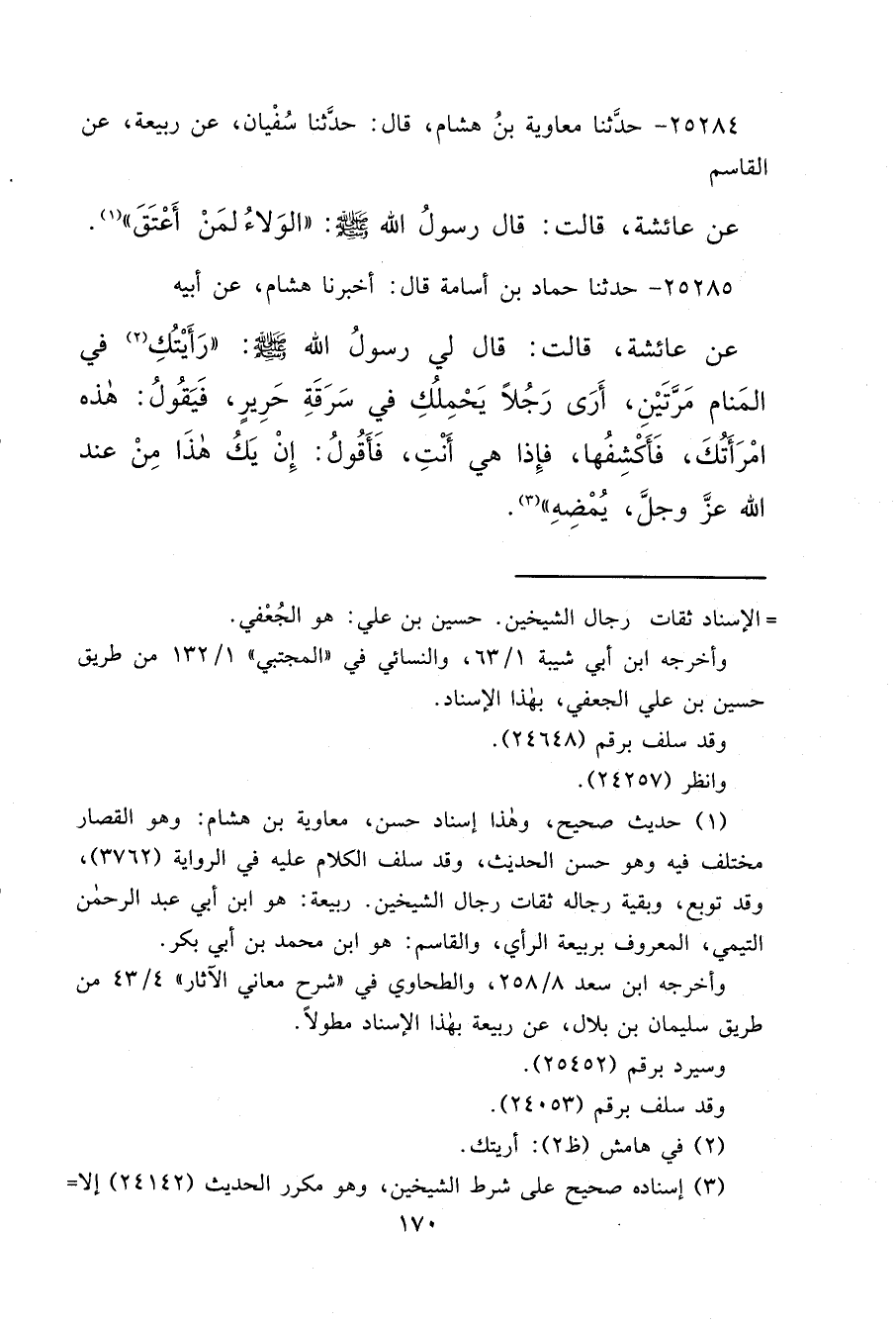 ٢٥٢٨٤ - حَدَّثَنَا مُعَاوِيَةُ بْنُ هِشَامٍ، قَالَ: حَدَّثَنَا سُفْيَانُ، عَنْ رَبِيعَةَ، عَنِ الْقَاسِمِ، عَنْ عَائِشَةَ، قَالَتْ: قَالَ رَسُولُ اللهِ صَلَّى اللهُ عَلَيْهِ وَسَلَّمَ: " الْوَلَاءُ لِمَنْ أَعْتَقَ " (١)