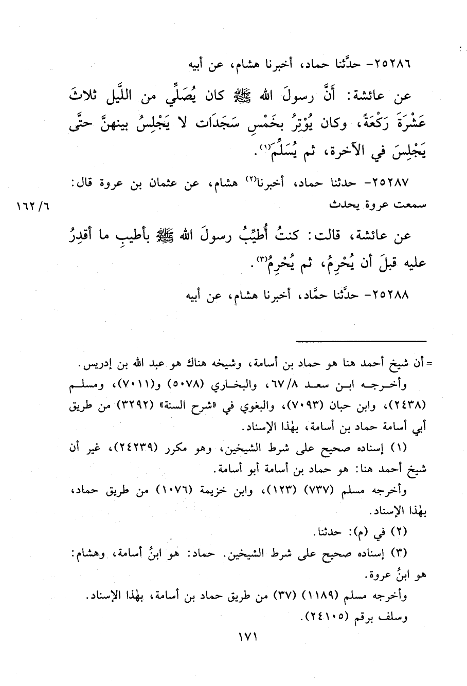 ٢٥٢٨٦ - حَدَّثَنَا حَمَّادٌ، أَخْبَرَنَا هِشَامٌ، عَنْ أَبِيهِ، عَنْ عَائِشَةَ: " أَنَّ رَسُولَ اللهِ صَلَّى اللهُ عَلَيْهِ وَسَلَّمَ كَانَ يُصَلِّي مِنَ اللَّيْلِ ثَلَاثَ عَشْرَةَ رَكْعَةً، وَكَانَ يُوتِرُ بِخَمْسِ سَجَدَاتٍ لَا يَجْلِسُ بَيْنَهُنَّ حَتَّى يَجْلِسَ فِي الْآخِرَةِ، ثُمَّ يُسَلِّمَ " (١)