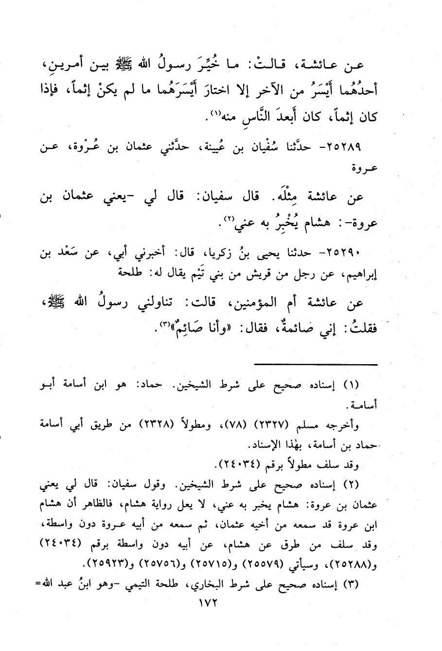 ٢٥٢٨٩ - حَدَّثَنَا سُفْيَانُ بْنُ عُيَيْنَةَ، حَدَّثَنِي عُثْمَانُ بْنُ عُرْوَةَ، عَنْ عُرْوَةَ، عَنْ عَائِشَةَ، مِثْلَهُ، قَالَ سُفْيَانُ: قَالَ لِي يَعْنِي عُثْمَانَ بْنَ عُرْوَةَ: هِشَامٌ يُخْبِرُ بِهِ عَنِّي (٢)