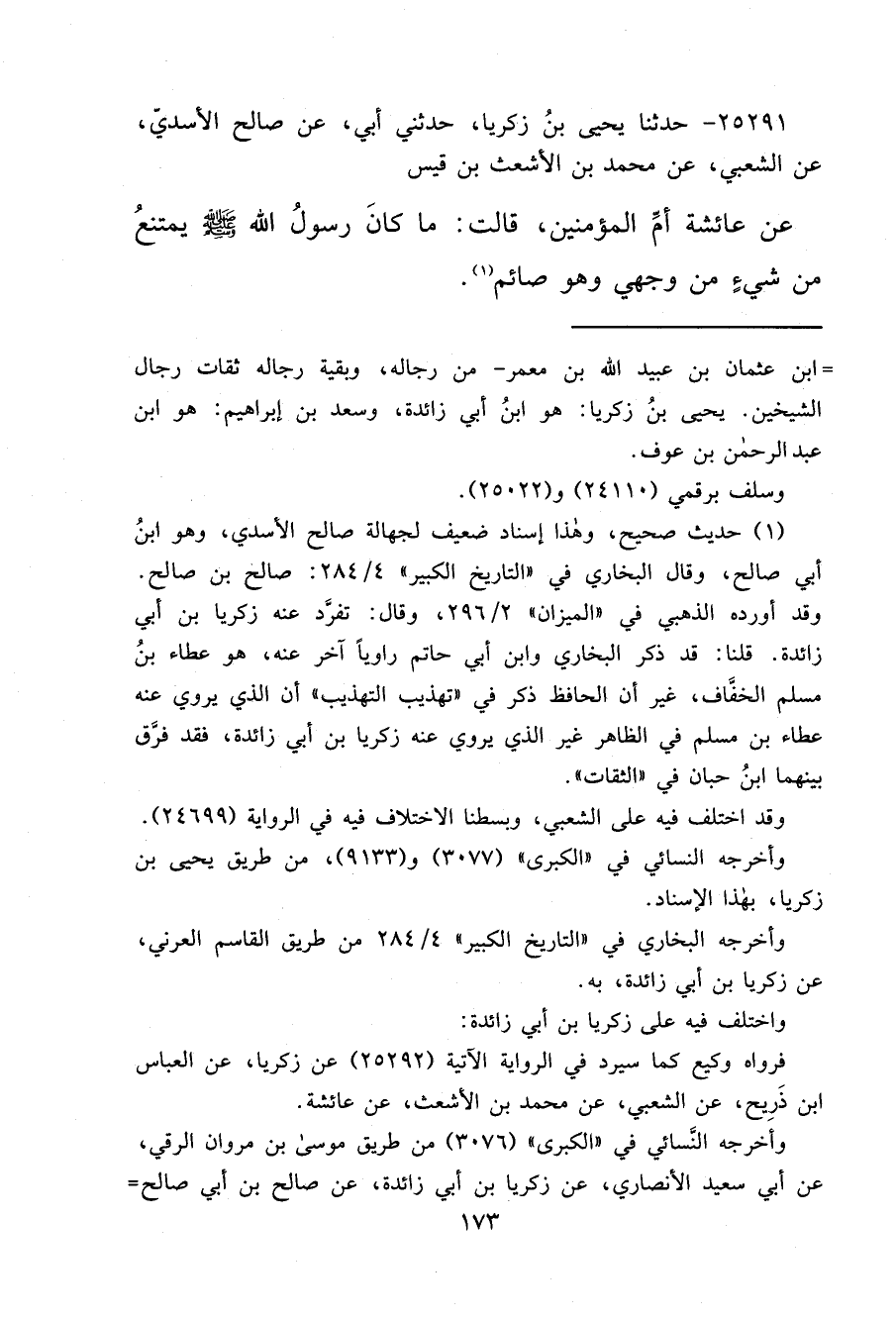 ٢٥٢٩١ - حَدَّثَنَا يَحْيَى بْنُ زَكَرِيَّا، حَدَّثَنِي أَبِي، عَنْ صَالِحٍ الْأَسَدِيِّ، عَنِ الشَّعْبِيِّ، عَنْ مُحَمَّدِ بْنِ الْأَشْعَثِ بْنِ قَيْسٍ، عَنْ عَائِشَةَ أُمِّ الْمُؤْمِنِينَ، قَالَتْ: " مَا كَانَ رَسُولُ اللهِ صَلَّى اللهُ عَلَيْهِ وَسَلَّمَ يَمْتَنِعُ مِنْ شَيْءٍ مِنْ وَجْهِي وَهُوَ صَائِمٌ " (١)