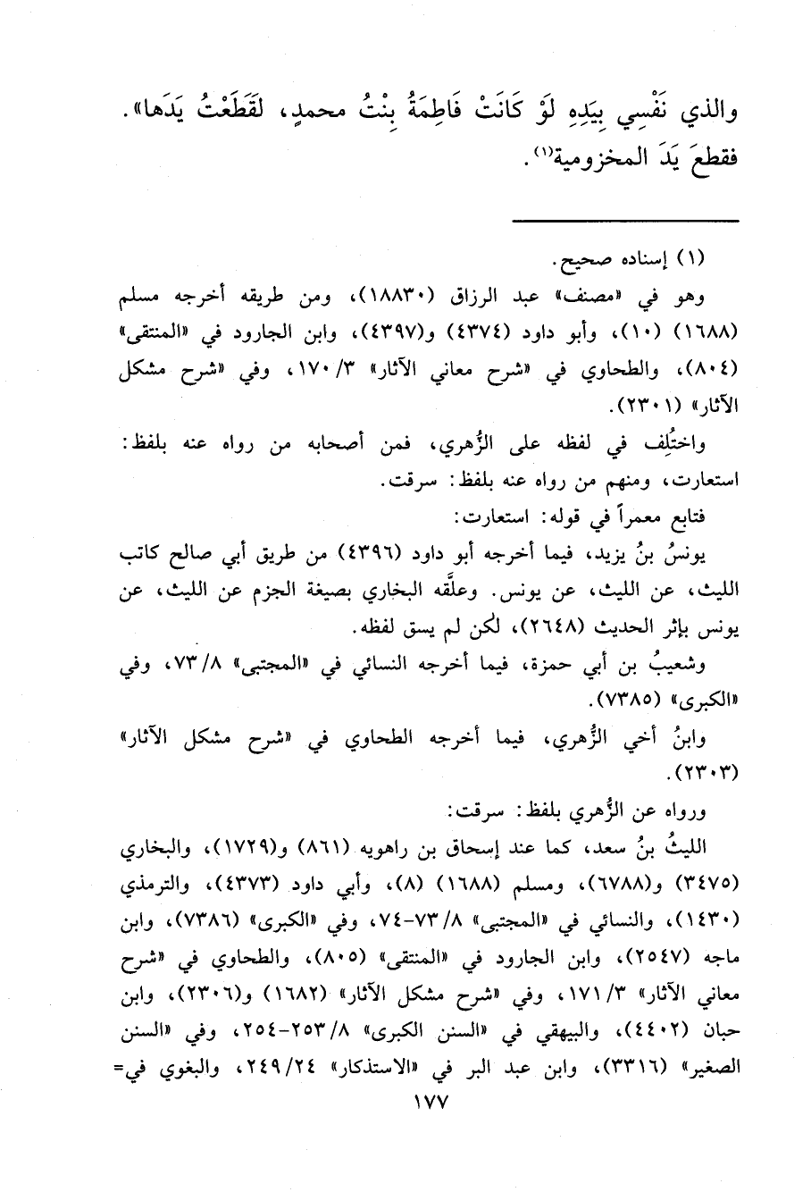 وَالَّذِي نَفْسِي بِيَدِهِ لَوْ كَانَتْ فَاطِمَةُ بِنْتُ مُحَمَّدٍ لَقَطَعْتُ يَدَهَا " فَقَطَعَ يَدَ الْمَخْزُومِيَّةِ (١)