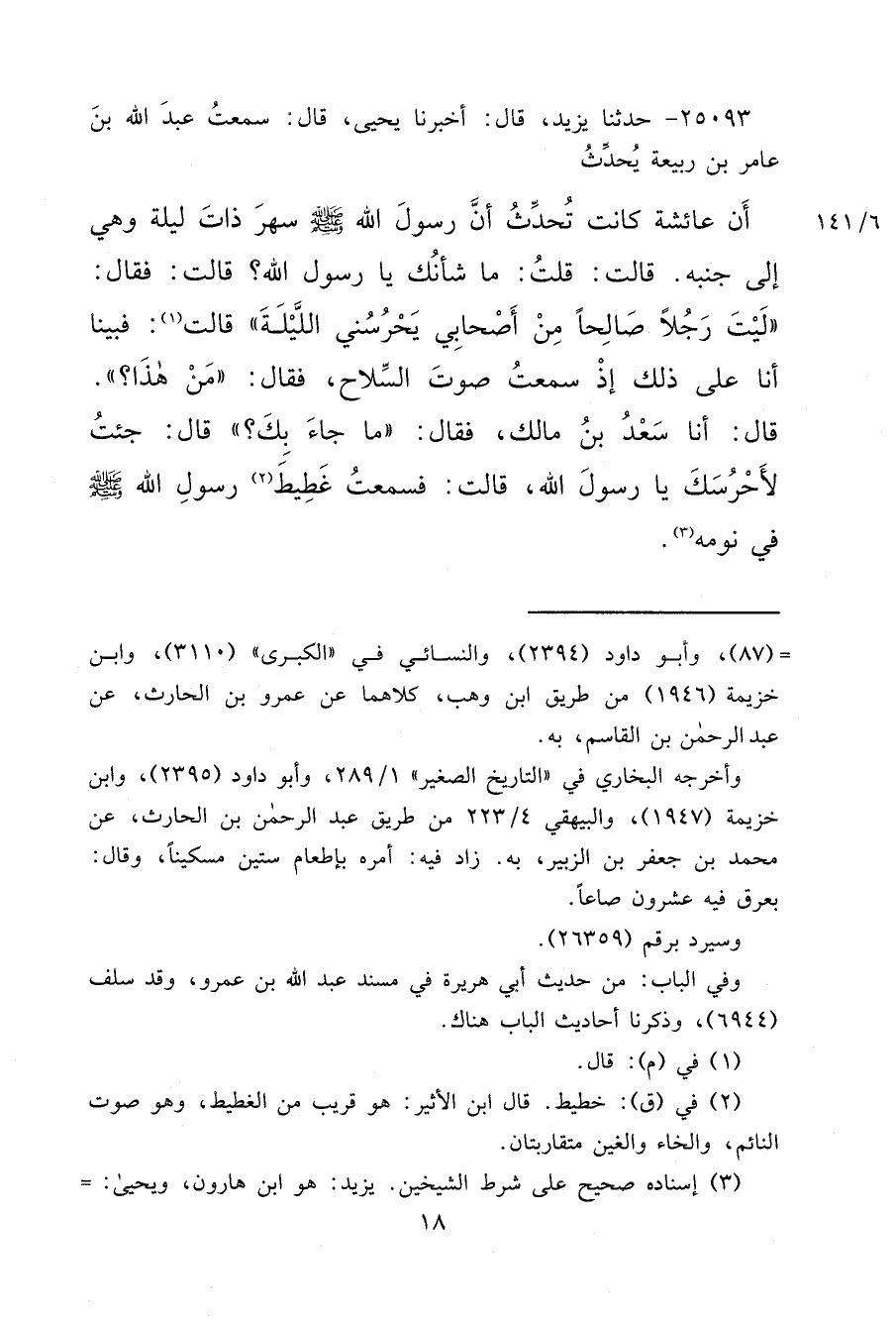 ٢٥٠٩٣ - حَدَّثَنَا يَزِيدُ، قَالَ: أَخْبَرَنَا يَحْيَى، قَالَ: سَمِعْتُ عَبْدَ اللهِ بْنَ عَامِرِ بْنِ رَبِيعَةَ، يُحَدِّثُ: أَنَّ عَائِشَةَ، كَانَتْ تُحَدِّثُ أَنَّ رَسُولَ اللهِ صَلَّى اللهُ عَلَيْهِ وَسَلَّمَ سَهِرَ ذَاتَ لَيْلَةٍ وَهِيَ إِلَى جَنْبِهِ. قَالَتْ: قُلْتُ: مَا شَأْنُكَ يَا رَسُولَ اللهِ؟ قَالَتْ: فَقَالَ: " لَيْتَ رَجُلًا صَالِحًا مِنْ أَصْحَابِي يَحْرُسُنِي اللَّيْلَةَ " قَالَتْ: (١) فَبَيْنَا أَنَا عَلَى ذَلِكَ إِذْ سَمِعْتُ صَوْتَ السِّلَاحِ، فَقَالَ: " مَنْ هَذَا؟ " قَالَ: أَنَا سَعْدُ بْنُ مَالِكٍ، فَقَالَ: " مَا جَاءَ بِكَ؟ " قَالَ: جِئْتُ لِأَحْرُسَكَ يَا رَسُولَ اللهِ، قَالَتْ: فَسَمِعْتُ غَطِيطَ (٢) رَسُولِ اللهِ صَلَّى اللهُ عَلَيْهِ وَسَلَّمَ فِي نَوْمِهِ (٣)