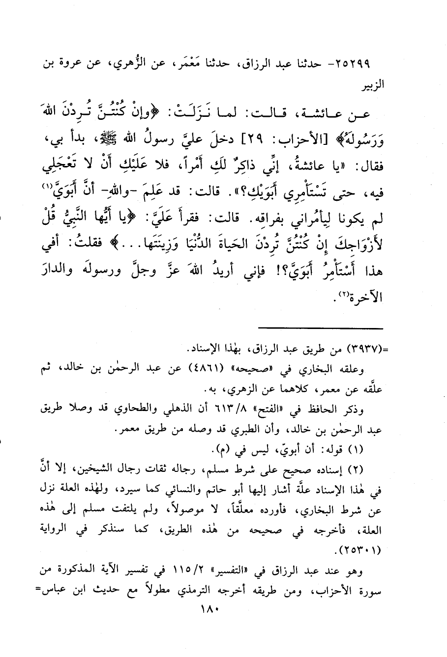 ٢٥٢٩٩ - حَدَّثَنَا عَبْدُ الرَّزَّاقِ، حَدَّثَنَا مَعْمَرٌ، عَنِ الزُّهْرِيِّ، عَنْ عُرْوَةَ بْنِ الزُّبَيْرِ، عَنْ عَائِشَةَ، قَالَتْ: لَمَّا نَزَلَتْ: {وَإِنْ كُنْتُنَّ تُرِدْنَ اللهَ وَرَسُولَهُ} [الأحزاب: ٢٩] دَخَلَ عَلَيَّ رَسُولُ اللهِ صَلَّى اللهُ عَلَيْهِ وَسَلَّمَ، بَدَأَ بِي، فَقَالَ: " يَا عَائِشَةُ، إِنِّي ذَاكِرٌ لَكِ أَمْرًا، فَلَا عَلَيْكِ أَنْ لَا تَعْجَلِي فِيهِ، حَتَّى تَسْتَأْمِرِي أَبَوَيْكِ؟ " قَالَتْ: قَدْ عَلِمَ - وَاللهِ - أَنَّ أَبَوَيَّ (١) لَمْ يَكُونَا لِيَأْمُرَانِي بِفِرَاقِهِ. قَالَتْ: فَقَرَأَ عَلَيَّ: {يَا أَيُّهَا النَّبِيُّ قُلْ لِأَزْوَاجِكَ إِنْ كُنْتُنَّ تُرِدْنَ الْحَيَاةَ الدُّنْيَا وَزِينَتَهَا} [الأحزاب: ٢٨] فَقُلْتُ: أَفِي هَذَا أَسْتَأْمِرُ أَبَوَيَّ؟ فَإِنِّي أُرِيدُ اللهَ عَزَّ وَجَلَّ وَرَسُولَهُ وَالدَّارَ الْآخِرَةَ (٢)
