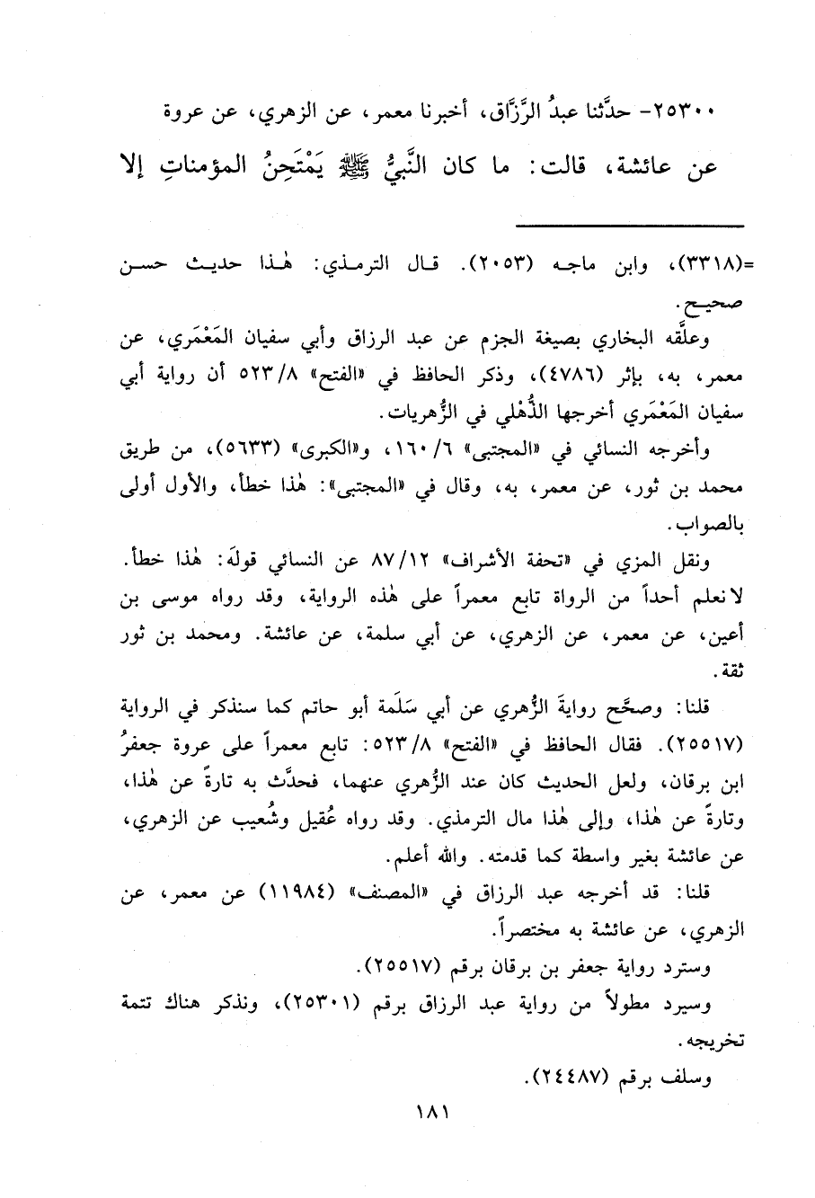 ٢٥٣٠٠ - حَدَّثَنَا عَبْدُ الرَّزَّاقِ، أَخْبَرَنَا مَعْمَرٌ، عَنِ الزُّهْرِيِّ، عَنْ عُرْوَةَ، عَنْ عَائِشَةَ، قَالَتْ: " مَا كَانَ النَّبِيُّ صَلَّى اللهُ عَلَيْهِ وَسَلَّمَ يَمْتَحِنُ الْمُؤْمِنَاتِ إِلَّا