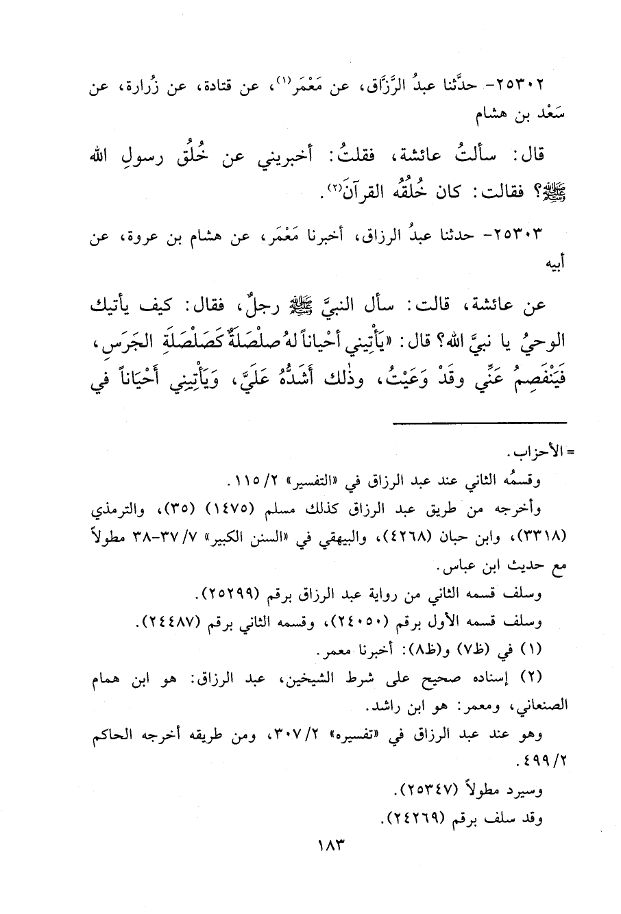٢٥٣٠٢ - حَدَّثَنَا عَبْدُ الرَّزَّاقِ، عَنْ مَعْمَرٍ، (١) عَنْ قَتَادَةَ، عَنْ زُرَارَةَ، عَنْ سَعْدِ بْنِ هِشَامٍ، قَالَ: سَأَلْتُ عَائِشَةَ، فَقُلْتُ: أَخْبِرِينِي عَنْ خُلُقِ رَسُولِ اللهِ صَلَّى اللهُ عَلَيْهِ وَسَلَّمَ؟ فَقَالَتْ: " كَانَ خُلُقُهُ الْقُرْآنَ " (٢)