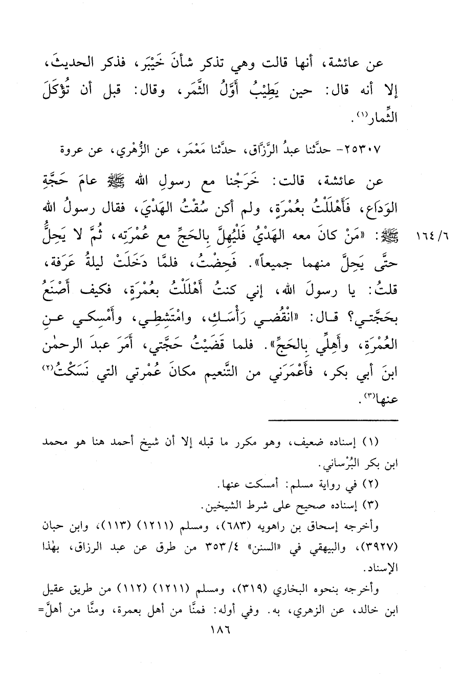 ٢٥٣٠٧ - حَدَّثَنَا عَبْدُ الرَّزَّاقِ، حَدَّثَنَا مَعْمَرٌ، عَنِ الزُّهْرِيِّ، عَنْ عُرْوَةَ، عَنْ عَائِشَةَ، قَالَتْ: خَرَجْنَا مَعَ رَسُولِ اللهِ صَلَّى اللهُ عَلَيْهِ وَسَلَّمَ عَامَ حَجَّةِ الْوَدَاعِ، فَأَهْلَلْتُ بِعُمْرَةٍ، وَلَمْ أَكُنْ سُقْتُ الْهَدْيَ، فَقَالَ رَسُولُ اللهِ صَلَّى اللهُ عَلَيْهِ وَسَلَّمَ: " مَنْ كَانَ مَعَهُ الْهَدْيُ فَلْيُهِلَّ بِالْحَجِّ مَعَ عُمْرَتِهِ، ثُمَّ لَا يَحِلَّ حَتَّى يَحِلَّ مِنْهُمَا جَمِيعًا " فَحِضْتُ، فَلَمَّا دَخَلَتْ لَيْلَةُ عَرَفَةَ، قُلْتُ: يَا رَسُولَ اللهِ، إِنِّي كُنْتُ أَهْلَلْتُ بِعُمْرَةٍ، فَكَيْفَ أَصْنَعُ بِحَجَّتِي؟ قَالَ: " انْقُضِي رَأْسَكِ، وَامْتَشِطِي، وَأَمْسِكِي عَنِ الْعُمْرَةِ، وَأَهِلِّي بِالْحَجِّ " فَلَمَّا قَضَيْتُ حَجَّتِي، أَمْرَ عَبْدَ الرَّحْمَنِ بْنَ أَبِي بَكْرٍ، فَأَعْمَرَنِي مِنَ التَّنْعِيمِ مَكَانَ عُمْرَتِي الَّتِي نَسَكْتُ (٢) عَنْهَا (٣)