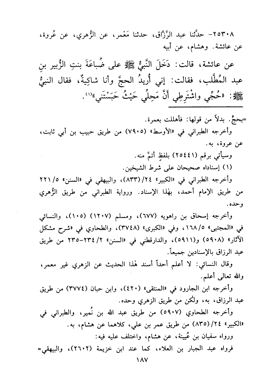 ٢٥٣٠٨ - حَدَّثَنَا عَبْدُ الرَّزَّاقِ، حَدَّثَنَا مَعْمَرٌ، عَنِ الزُّهْرِيِّ، عَنْ عُرْوَةَ، عَنْ عَائِشَةَ، وَهِشَامٌ، عَنْ أَبِيهِ، عَنْ عَائِشَةَ، قَالَتْ: دَخَلَ النَّبِيُّ صَلَّى اللهُ عَلَيْهِ وَسَلَّمَ عَلَى ضُبَاعَةَ بِنْتِ الزُّبَيْرِ بْنِ عَبْدِ الْمُطَّلِبِ، فَقَالَتْ: إِنِّي أُرِيدُ الْحَجَّ وَأَنَا شَاكِيَةٌ، فَقَالَ النَّبِيُّ صَلَّى اللهُ عَلَيْهِ وَسَلَّمَ: " حُجِّي وَاشْتَرِطِي أَنَّ مَحِلِّي حَيْثُ حَبَسْتَنِي " (١)