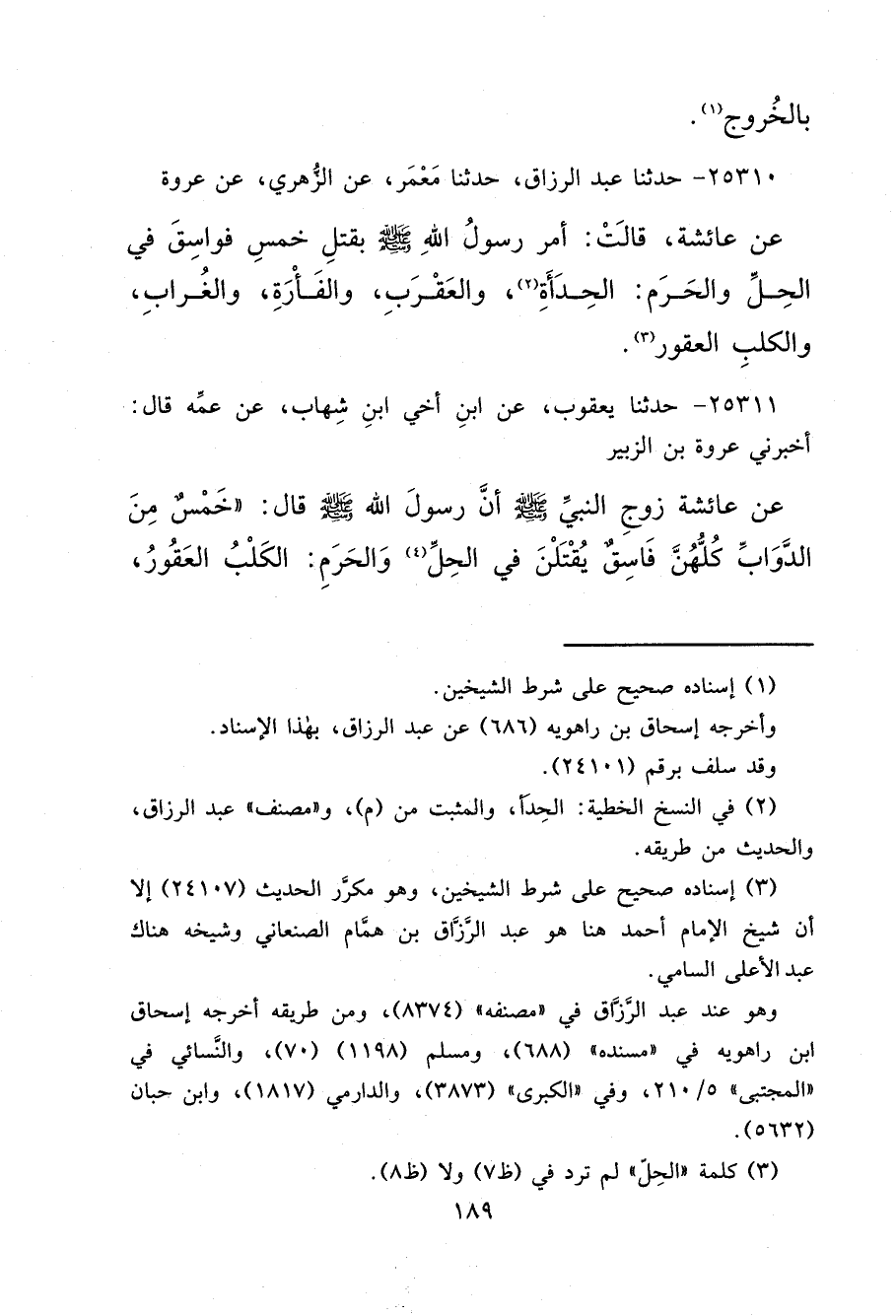 ٢٥٣١٠ - حَدَّثَنَا عَبْدُ الرَّزَّاقِ، حَدَّثَنَا مَعْمَرٌ، عَنِ الزُّهْرِيِّ، عَنْ عُرْوَةَ، عَنْ عَائِشَةَ، قَالَتْ: " أَمَرَ رَسُولُ اللهِ صَلَّى اللهُ عَلَيْهِ وَسَلَّمَ بِقَتْلِ خَمْسِ فَوَاسِقَ فِي الْحِلِّ وَالْحَرَمِ: الْحِدَأَةِ، (٢) وَالْعَقْرَبِ، وَالْفَأْرَةِ، وَالْغُرَابِ، وَالْكَلْبِ الْعَقُورِ " (٣)