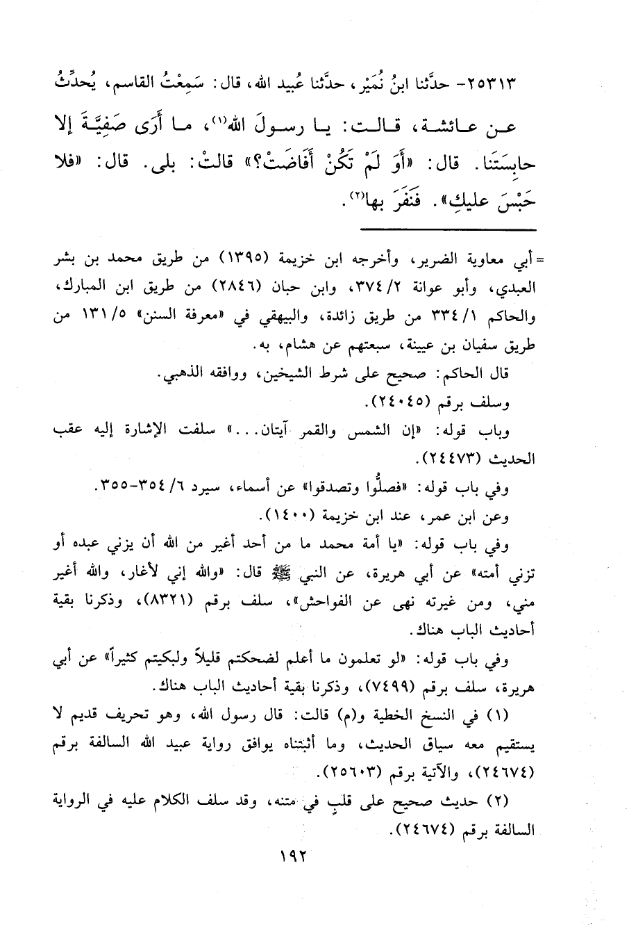 ٢٥٣١٣ - حَدَّثَنَا ابْنُ نُمَيْرٍ، حَدَّثَنَا عُبَيْدُ اللهِ، قَالَ: سَمِعْتُ الْقَاسِمَ، يُحَدِّثُ: عَنْ عَائِشَةَ، قَالَتْ: يَا رَسُولُ اللهِ (١) : مَا أَرَى صَفِيَّةَ إِلَّا حَابِسَتُنَا. قَالَ: " أَوَ لَمْ تَكُنْ أَفَاضَتْ؟ " قَالَتْ: بَلَى. قَالَ: " فَلَا حَبْسَ عَلَيْكِ " فَنَفَرَ بِهَا (٢)