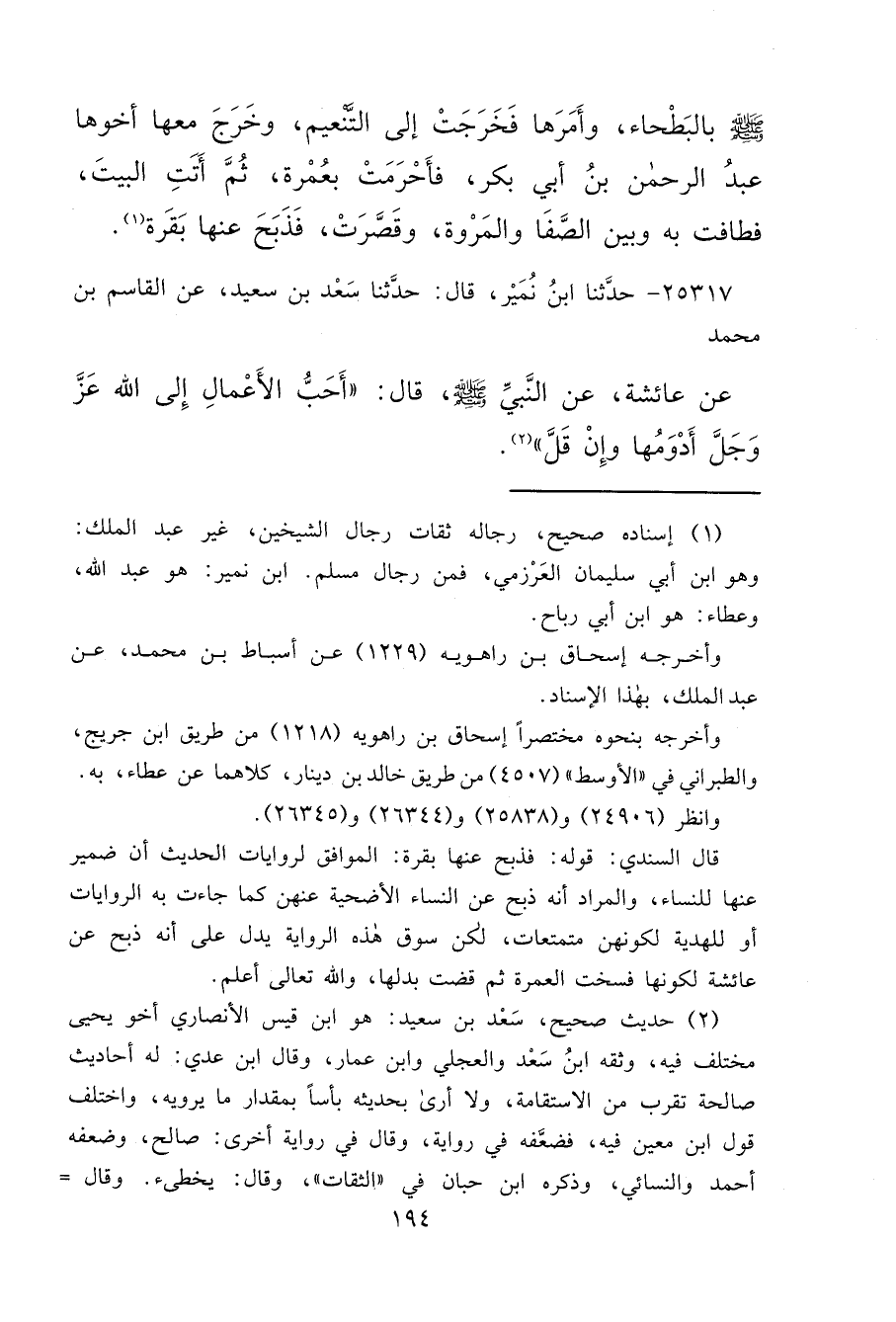 ٢٥٣١٧ - حَدَّثَنَا ابْنُ نُمَيْرٍ، قَالَ: حَدَّثَنَا سَعْدُ بْنُ سَعِيدٍ، عَنِ الْقَاسِمِ بْنِ مُحَمَّدٍ، عَنْ عَائِشَةَ، عَنِ النَّبِيِّ صَلَّى اللهُ عَلَيْهِ وَسَلَّمَ قَالَ: " أَحَبُّ الْأَعْمَالِ إِلَى اللهِ عَزَّ وَجَلَّ أَدْوَمُهَا وَإِنْ قَلَّ " (٢)