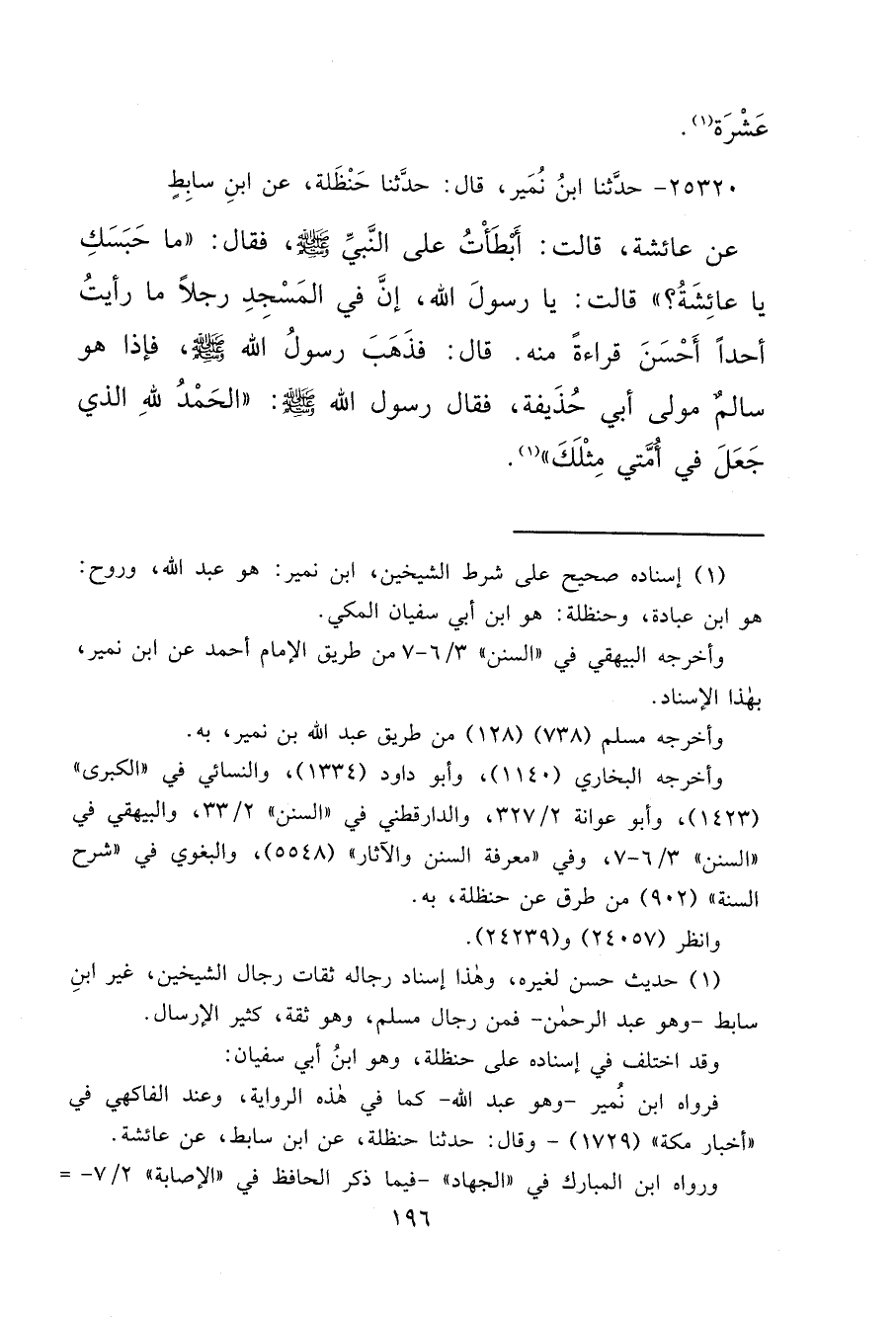 ٢٥٣٢٠ - حَدَّثَنَا ابْنُ نُمَيْرٍ، قَالَ: حَدَّثَنَا حَنْظَلَةُ، عَنِ ابْنِ سَابِطٍ، عَنْ عَائِشَةَ، قَالَتْ: أَبْطَأْتُ عَلَى النَّبِيِّ صَلَّى اللهُ عَلَيْهِ وَسَلَّمَ، فَقَالَ: " مَا حَبَسَكِ يَا عَائِشَةُ؟ " قَالَتْ: يَا رَسُولَ اللهِ، إِنَّ فِي الْمَسْجِدِ رَجُلًا مَا رَأَيْتُ أَحَدًا أَحْسَنَ قِرَاءَةً مِنْهُ. قَالَ: فَذَهَبَ رَسُولُ اللهِ صَلَّى اللهُ عَلَيْهِ وَسَلَّمَ، فَإِذَا هُوَ سَالِمٌ مَوْلَى أَبِي حُذَيْفَةَ، فَقَالَ رَسُولُ اللهِ صَلَّى اللهُ عَلَيْهِ وَسَلَّمَ: " الْحَمْدُ لِلَّهِ الَّذِي جَعَلَ فِي أُمَّتِي مِثْلَكَ " (٢)