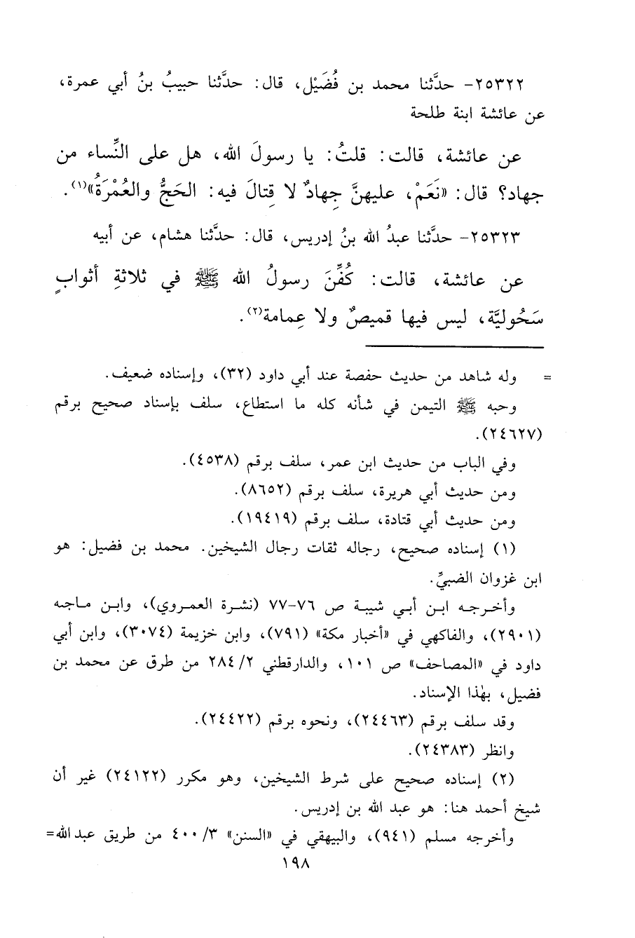٢٥٣٢٢ - حَدَّثَنَا مُحَمَّدُ بْنُ فُضَيْلٍ، قَالَ: حَدَّثَنَا حَبِيبُ بْنُ أَبِي عَمْرَةَ، عَنْ عَائِشَةَ ابْنَةِ طَلْحَةَ، عَنْ عَائِشَةَ، قَالَتْ: قُلْتُ: يَا رَسُولَ اللهِ، هَلْ عَلَى النِّسَاءِ مِنْ جِهَادٍ؟ قَالَ: " نَعَمْ، عَلَيْهِنَّ جِهَادٌ لَا قِتَالَ فِيهِ: الْحَجُّ وَالْعُمْرَةُ " (١)