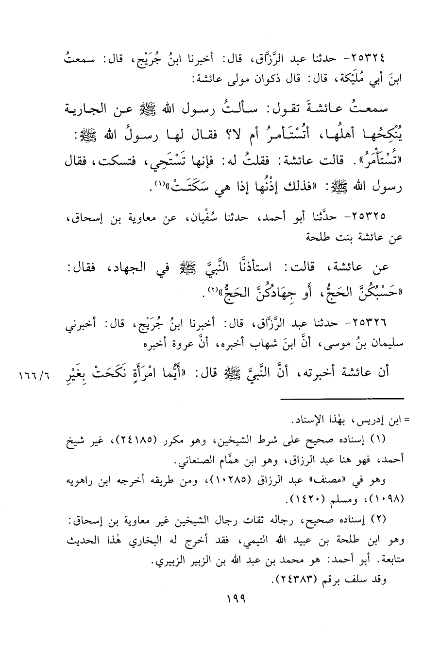 ٢٥٣٢٤ - حَدَّثَنَا عَبْدُ الرَّزَّاقِ، قَالَ: أَخْبَرَنَا ابْنُ جُرَيْجٍ، قَالَ: سَمِعْتُ ابْنَ أَبِي مُلَيْكَةَ، قَالَ: قَالَ ذَكْوَانُ، مَوْلَى عَائِشَةَ: سَمِعْتُ عَائِشَةَ، تَقُولُ: سَأَلْتُ رَسُولَ اللهِ صَلَّى اللهُ عَلَيْهِ وَسَلَّمَ عَنْ الْجَارِيَةِ يُنْكِحُهَا أَهْلُهَا، أَتُسْتَأْمَرُ أَمْ لَا؟ فَقَالَ لَهَا رَسُولُ اللهِ صَلَّى اللهُ عَلَيْهِ وَسَلَّمَ: " تُسْتَأْمَرُ " قَالَتْ عَائِشَةُ: فَقُلْتُ لَهُ: فَإِنَّهَا تَسْتَحِي، فَتَسْكُتُ، فَقَالَ رَسُولُ اللهِ صَلَّى اللهُ عَلَيْهِ وَسَلَّمَ: " فَذَلِكَ إِذْنُهَا إِذَا هِيَ سَكَتَتْ " (١)