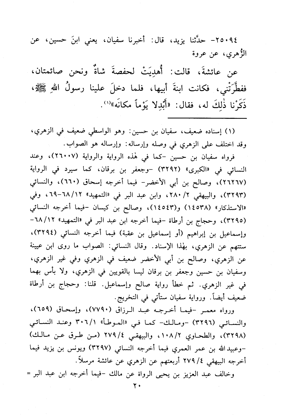 ٢٥٠٩٤ - حَدَّثَنَا يَزِيدُ، قَالَ: أَخْبَرَنَا سُفْيَانُ يَعْنِي ابْنَ حُسَيْنٍ، عَنِ الزُّهْرِيِّ، عَنْ عُرْوَةَ، عَنْ عَائِشَةَ، قَالَتْ: أُهْدِيَتْ لِحَفْصَةَ شَاةٌ وَنَحْنُ صَائِمَتَانِ، فَفَطَّرَتْنِي، فَكَانَتْ ابْنَةَ أَبِيهَا، فَلَمَّا دَخَلَ عَلَيْنَا رَسُولُ اللهِ صَلَّى اللهُ عَلَيْهِ وَسَلَّمَ، ذَكَرْنَا ذَلِكَ لَهُ، فَقَالَ: " أَبْدِلَا يَوْمًا مَكَانَهُ " (١)