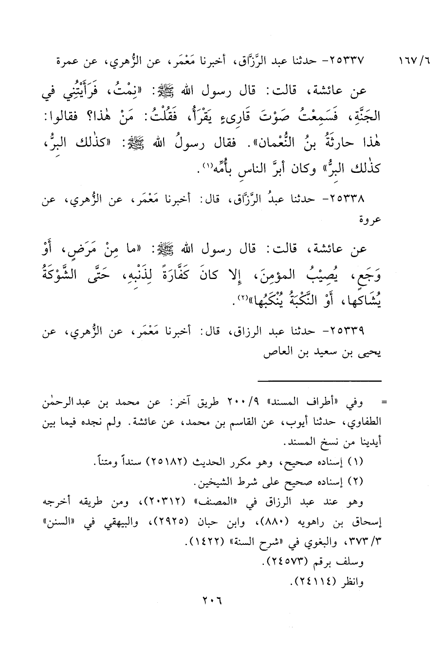 ٢٥٣٣٧ - حَدَّثَنَا عَبْدُ الرَّزَّاقِ، أَخْبَرَنَا مَعْمَرٌ، عَنِ الزُّهْرِيِّ، عَنْ عَمْرَةَ، عَنْ عَائِشَةَ، قَالَتْ: قَالَ رَسُولُ اللهِ صَلَّى اللهُ عَلَيْهِ وَسَلَّمَ: " نِمْتُ، فَرَأَيْتُنِي فِي الْجَنَّةِ، فَسَمِعْتُ صَوْتَ قَارِئٍ يَقْرَأُ، فَقُلْتُ: مَنْ هَذَا؟ فَقَالُوا: هَذَا حَارِثَةُ بْنُ النُّعْمَانِ " فَقَالَ رَسُولُ اللهِ صَلَّى اللهُ عَلَيْهِ وَسَلَّمَ: " كَذَلِكَ الْبِرُّ، كَذَلِكَ الْبِرُّ " وَكَانَ أَبَرَّ النَّاسِ بِأُمِّهِ (١)