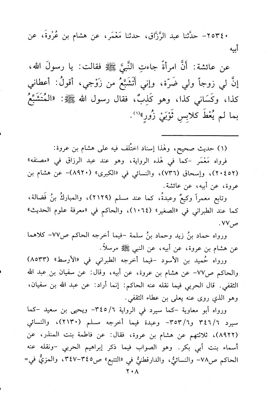 ٢٥٣٤٠ - حَدَّثَنَا عَبْدُ الرَّزَّاقِ، حَدَّثَنَا مَعْمَرٌ، عَنْ هِشَامِ بْنِ عُرْوَةَ، عَنْ أَبِيهِ، عَنْ عَائِشَةَ: أَنَّ امْرَأَةً جَاءَتِ النَّبِيَّ صَلَّى اللهُ عَلَيْهِ وَسَلَّمَ فَقَالَتْ: يَا رَسُولَ اللهِ، إِنَّ لِي زَوْجًا وَلِي ضَرَّةً، وَإِنِّي أَتَشَبَّعُ مِنْ زَوْجِي، أَقُولُ أَعْطَانِي كَذَا، وَكَسَانِي كَذَا، وَهُوَ كَذِبٌ، فَقَالَ رَسُولُ اللهِ صَلَّى اللهُ عَلَيْهِ وَسَلَّمَ: " الْمُتَشَبِّعُ بِمَا لَمْ يُعْطَ كَلَابِسِ ثَوْبَيْ زُورٍ " (١)
