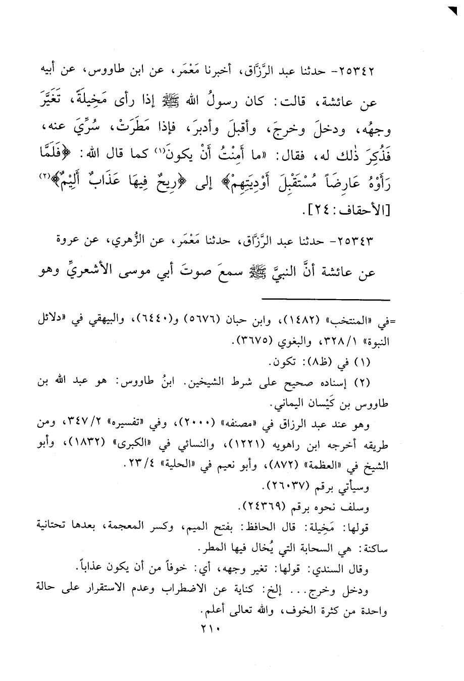 ٢٥٣٤٢ - حَدَّثَنَا عَبْدُ الرَّزَّاقِ، أَخْبَرَنَا مَعْمَرٌ، عَنِ ابْنِ طَاوُسٍ، عَنْ أَبِيهِ، عَنْ عَائِشَةَ، قَالَتْ: كَانَ رَسُولُ اللهِ صَلَّى اللهُ عَلَيْهِ وَسَلَّمَ إِذَا رَأَى مَخِيلَةً، تَغَيَّرَ وَجْهُهُ، وَدَخَلَ وَخَرَجَ، وَأَقْبَلَ وَأَدْبَرَ، فَإِذَا مُطِرَتْ سُرِّيَ عَنْهُ، فَذُكِرَ ذَلِكَ لَهُ، فَقَالَ: " مَا أَمِنْتُ أَنْ يَكُونَ (١) كَمَا قَالَ اللهُ: {فَلَمَّا رَأَوْهُ عَارِضًا مُسْتَقْبِلَ أَوْدِيَتِهِمْ} [الأحقاف: ٢٤] إِلَى {رِيحٌ فِيهَا عَذَابٌ أَلِيمٌ} (٢) [الأحقاف: ٢٤] "