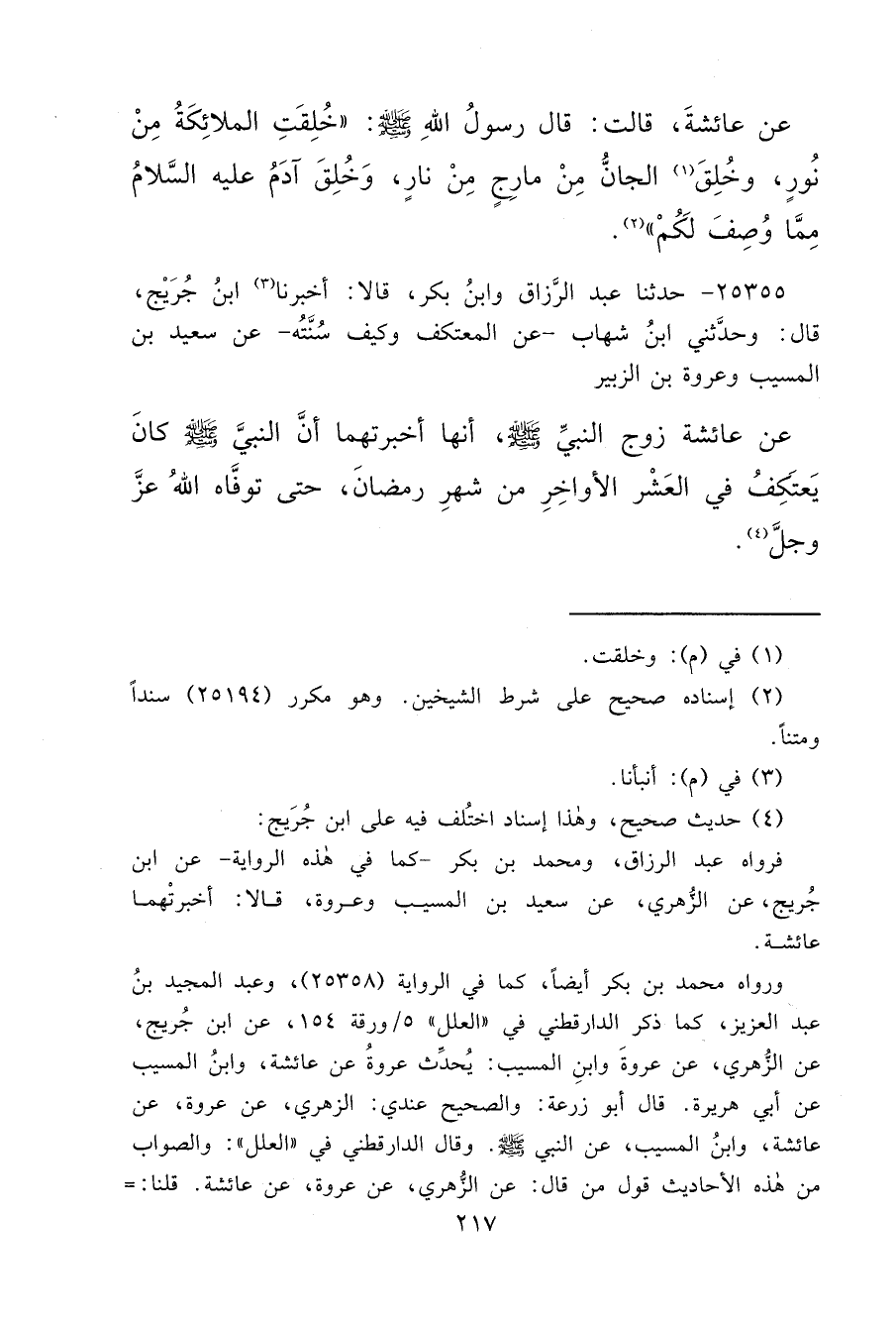 عَنْ عَائِشَةَ، قَالَتْ: قَالَ رَسُولُ اللهِ صَلَّى اللهُ عَلَيْهِ وَسَلَّمَ: " خُلِقَتِ الْمَلَائِكَةُ مِنْ نُورٍ، وَخُلِقَ (١) الْجَانُّ مِنْ مَارِجٍ مِنْ نَارٍ، وَخُلِقَ آدَمُ عَلَيْهِ السَّلَامُ مِمَّا وُصِفَ لَكُمْ " (٢)