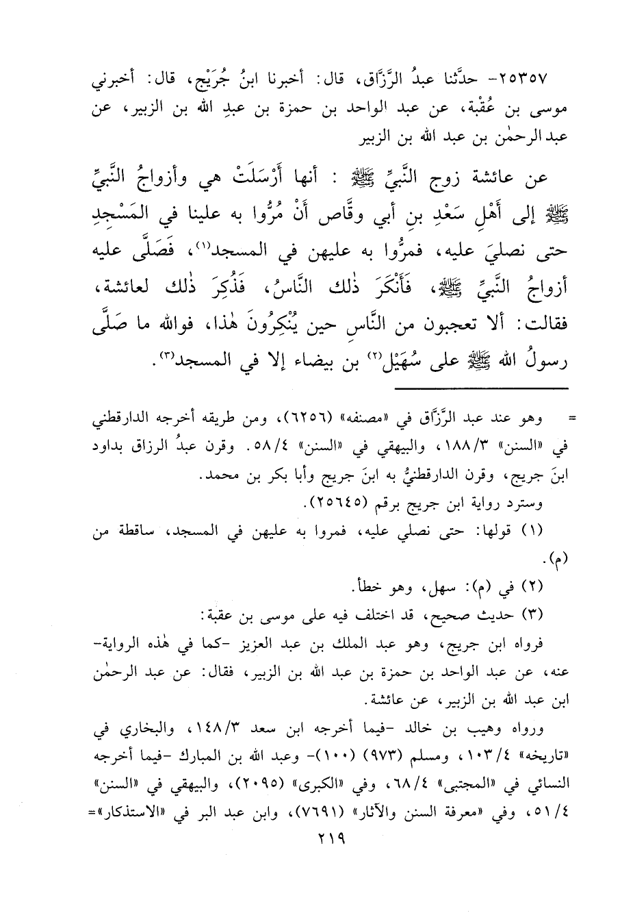 ٢٥٣٥٧ - حَدَّثَنَا عَبْدُ الرَّزَّاقِ، قَالَ: أَخْبَرَنَا ابْنُ جُرَيْجٍ، قَالَ: أَخْبَرَنِي مُوسَى بْنُ عُقْبَةَ، عَنْ عَبْدِ الْوَاحِدِ بْنِ حَمْزَةَ بْنِ عَبْدِ اللهِ بْنِ الزُّبَيْرِ، عَنْ عَبْدِ الرَّحْمَنِ بْنِ عَبْدِ اللهِ بْنِ الزُّبَيْرِ، عَنْ عَائِشَةَ زَوْجِ النَّبِيِّ صَلَّى اللهُ عَلَيْهِ وَسَلَّمَ، أَنَّهَا أَرْسَلَتْ هِيَ وَأَزْوَاجُ النَّبِيِّ صَلَّى اللهُ عَلَيْهِ وَسَلَّمَ إِلَى أَهْلِ سَعْدِ بْنِ أَبِي وَقَّاصٍ أَنْ مُرُّوا بِهِ عَلَيْنَا فِي الْمَسْجِدِ، حَتَّى نُصَلِّيَ عَلَيْهِ، فَمَرُّوا بِهِ عَلَيْهِنَّ فِي الْمَسْجِدِ (١) ، فَصَلَّى عَلَيْهِ أَزْوَاجُ النَّبِيِّ صَلَّى اللهُ عَلَيْهِ وَسَلَّمَ، فَأَنْكَرَ ذَلِكَ النَّاسُ، فَذُكِرَ ذَلِكَ لِعَائِشَةَ، فَقَالَتْ: " أَلَا تَعْجَبُونَ مِنَ النَّاسِ حِينَ يُنْكِرُونَ هَذَا، فَوَاللهِ مَا صَلَّى رَسُولُ اللهِ صَلَّى اللهُ عَلَيْهِ وَسَلَّمَ عَلَى سُهَيْلِ (٢) ابْنِ بَيْضَاءَ إِلَّا فِي الْمَسْجِدِ " (٣)