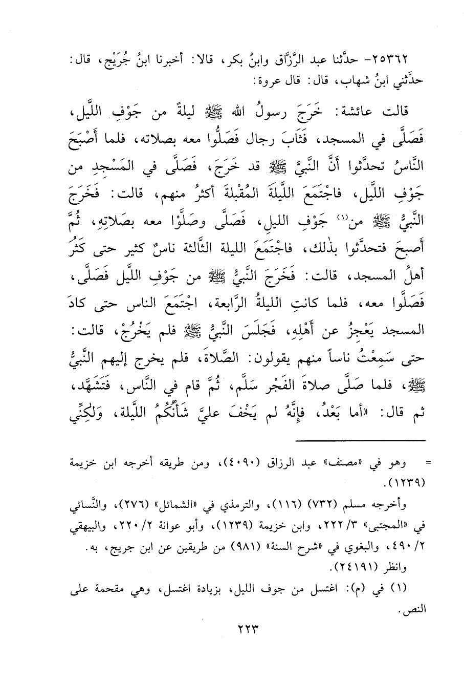 ٢٥٣٦٢ - حَدَّثَنَا عَبْدُ الرَّزَّاقِ، وَابْنُ بَكْرٍ، قَالَا: أَخْبَرَنَا ابْنُ جُرَيْجٍ، قَالَ: حَدَّثَنِي ابْنُ شِهَابٍ، قَالَ: قَالَ عُرْوَةُ: قَالَتْ عَائِشَةُ: خَرَجَ رَسُولُ اللهِ صَلَّى اللهُ عَلَيْهِ وَسَلَّمَ لَيْلَةً مِنْ جَوْفِ اللَّيْلِ، فَصَلَّى فِي الْمَسْجِدِ، فَثَابَ رِجَالٌ فَصَلَّوْا مَعَهُ بِصَلَاتِهِ، فَلَمَّا أَصْبَحَ النَّاسُ تَحَدَّثُوا أَنَّ النَّبِيَّ صَلَّى اللهُ عَلَيْهِ وَسَلَّمَ قَدْ خَرَجَ، فَصَلَّى فِي الْمَسْجِدِ مِنْ جَوْفِ اللَّيْلِ، فَاجْتَمَعَ اللَّيْلَةَ الْمُقْبِلَةَ أَكْثَرُ مِنْهُمْ، قَالَتْ: فَخَرَجَ النَّبِيُّ صَلَّى اللهُ عَلَيْهِ وَسَلَّمَ مِنْ (١) جَوْفِ اللَّيْلِ، فَصَلَّى وَصَلَّوْا مَعَهُ بِصَلَاتِهِ، ثُمَّ أَصْبَحَ فَتَحَدَّثُوا بِذَلِكَ، فَاجْتَمَعَ اللَّيْلَةَ الثَّالِثَةَ نَاسٌ كَثِيرٌ حَتَّى كَثُرَ أَهْلُ الْمَسْجِدِ، قَالَتْ: فَخَرَجَ النَّبِيُّ صَلَّى اللهُ عَلَيْهِ وَسَلَّمَ مِنْ جَوْفِ اللَّيْلِ فَصَلَّى، فَصَلَّوْا مَعَهُ، فَلَمَّا كَانَتِ اللَّيْلَةُ الرَّابِعَةُ، اجْتَمَعَ النَّاسُ حَتَّى كَادَ الْمَسْجِدُ يَعْجَزُ عَنْ أَهْلِهِ، فَجَلَسَ النَّبِيُّ صَلَّى اللهُ عَلَيْهِ وَسَلَّمَ فَلَمْ يَخْرُجْ، قَالَتْ: حَتَّى سَمِعْتُ نَاسًا مِنْهُمْ يَقُولُونَ: الصَّلَاةَ، فَلَمْ يَخْرُجْ إِلَيْهِمُ النَّبِيُّ صَلَّى اللهُ عَلَيْهِ وَسَلَّمَ، فَلَمَّا صَلَّى صَلَاةَ الْفَجْرِ سَلَّمَ، ثُمَّ قَامَ فِي النَّاسِ، فَتَشَهَّدَ، ثُمَّ قَالَ: " أَمَّا بَعْدُ، فَإِنَّهُ لَمْ يَخْفَ عَلَيَّ شَأْنُكُمُ اللَّيْلَةَ، وَلَكِنِّي