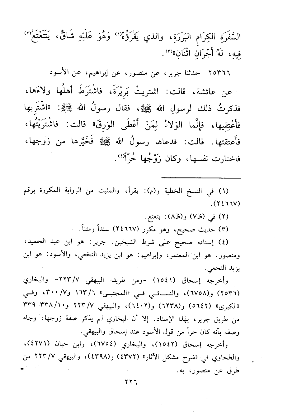 ٢٥٣٦٦ - حَدَّثَنَا جَرِيرٌ، عَنْ مَنْصُورٍ، عَنْ إِبْرَاهِيمَ، عَنِ الْأَسْوَدِ، عَنْ عَائِشَةَ، قَالَتْ: اشْتَرَيْتُ بَرِيرَةَ، فَاشْتَرَطَ أَهْلُهَا وَلَاءَهَا، فَذَكَرْتُ ذَلِكَ لِرَسُولِ اللهِ صَلَّى اللهُ عَلَيْهِ وَسَلَّمَ، فَقَالَ رَسُولُ اللهِ صَلَّى اللهُ عَلَيْهِ وَسَلَّمَ: " اشْتَرِيهَا فَأَعْتِقِيهَا، فَإِنَّمَا الْوَلَاءُ لِمَنْ أَعْطَى الْوَرِقَ " قَالَتْ: فَاشْتَرَيْتُهَا، فَأَعْتَقْتُهَا. قَالَتْ: فَدَعَاهَا رَسُولُ اللهِ صَلَّى اللهُ عَلَيْهِ وَسَلَّمَ فَخَيَّرَهَا مِنْ زَوْجِهَا، فَاخْتَارَتْ نَفْسَهَا، وَكَانَ زَوْجُهَا حُرًّا (٤)