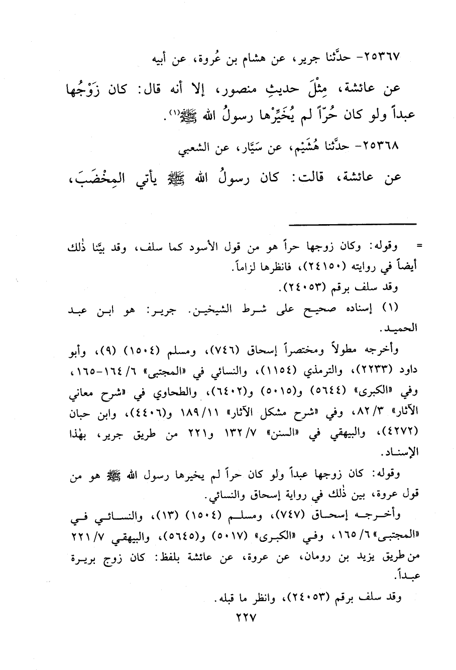 ٢٥٣٦٧ - حَدَّثَنَا جَرِيرٌ، عَنْ هِشَامِ بْنِ عُرْوَةَ، عَنْ أَبِيهِ، عَنْ عَائِشَةَ، مِثْلَ حَدِيثِ مَنْصُورٍ إِلَّا أَنَّهُ قَالَ: كَانَ زَوْجُهَا عَبْدًا وَلَوْ كَانَ حُرًّا لَمْ يُخَيِّرْهَا رَسُولُ اللهِ صَلَّى اللهُ عَلَيْهِ وَسَلَّمَ (١)