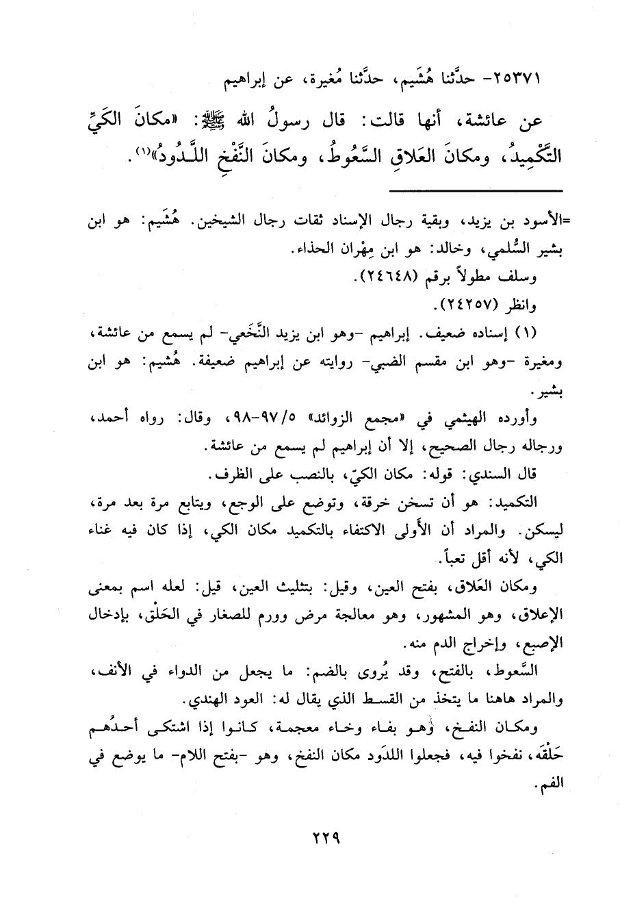 ٢٥٣٧١ - حَدَّثَنَا هُشَيْمٌ، حَدَّثَنَا مُغِيرَةُ، عَنْ إِبْرَاهِيمَ، عَنْ عَائِشَةَ، أَنَّهَا قَالَتْ: قَالَ رَسُولُ اللهِ صَلَّى اللهُ عَلَيْهِ وَسَلَّمَ: " مَكَانُ الْكَيِّ التَّكْمِيدُ، وَمَكَانُ الْعِلَاقِ السَّعُوطُ، وَمَكَانُ النَّفْخِ اللَّدُودُ " (١)